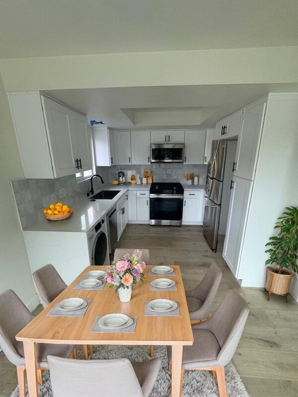 Property Id: 2183261 Bright & Spacious 2-Bedroom Upper Unit with Modern Touches Welcome to this beautifully updated upper-floor 2-bedroom, 1-bathroom home filled with natural light and stylish finishes. Enjoy sleek laminate flooring throughout and a contemporary kitchen featuring quartz countertops, a designer backsplash, and brand-new appliances. The convenience of an in-unit washer and dryer adds to the comfort. Step outside to a generous front balcony—perfect for entertaining friends and family or relaxing in the fresh air. Ideally located near major freeways, shopping centers, and local parks, this home offers both tranquility and accessibility.