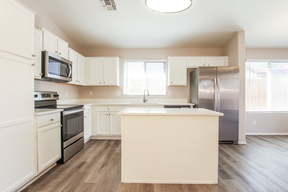 Please note, our homes are available on a first-come, first-serve basis and are not reserved until the lease is signed by all applicants and security deposits are collected. This home features Progress Smart Home - Progress Residential's smart home app, which allows you to control the home securely from any of your devices. Learn more at Want to tour on your own? Click the “Self Tour” button on this home’s listing or call to register for a self-guided showing at a time that works best for you. Enjoy the open plan of this four-bedroom, two-bathroom rental home in Phoenix. Vinyl plank flooring and a vaulted ceiling with a lighted fan make the living room stylish and practical. The dining room's glass and metal chandelier brightens festive dinners with friends or family. Sliding glass doors take you from this area to the covered patio in the fenced backyard. The kitchen's quartz countertops and island offer convenience for the household's chef. Located away from the secondary bedrooms, the serene main suite offers neutral decor and a walk-in closet. Its private bathroom features a walk-in shower with a glass door and a garden tub to relax in at the end of a long day. Tour this home soon.