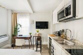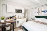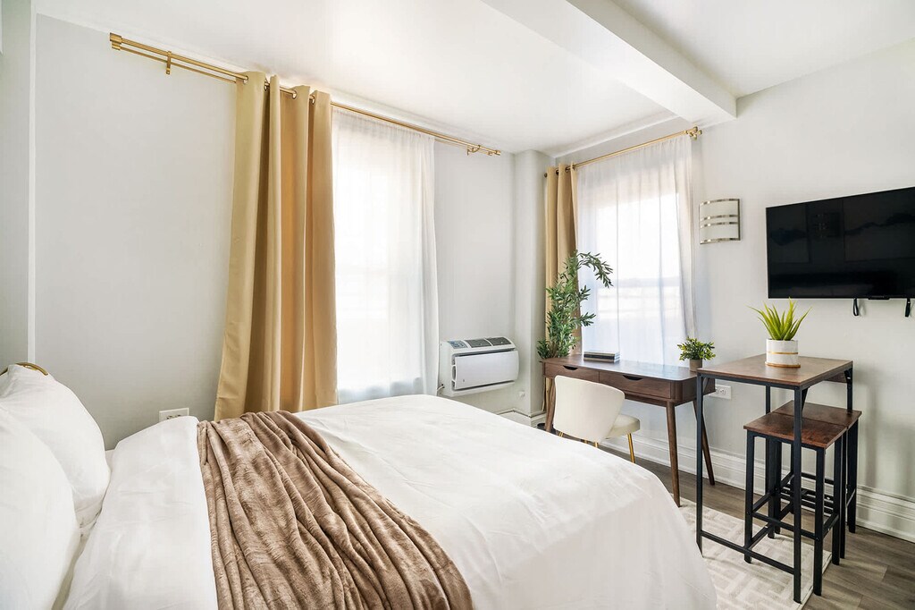 Welcome to this beautifully remodeled studio, located on the 15th floor, designed for both comfort and convenience. This fully furnished space features refinished hardwood floors, multiple windows for natural light, and a closet for your storage needs. The modern kitchen offers great cabinet space and a mini refrigerator, providing all the essentials to prepare meals and snacks. Relax in the cozy living area, complete with a comfortable couch, a 50” Smart HDTV, Wi-Fi, and air conditioning for the summer months. The queen-size bed with a plush memory foam mattress ensures a restful night's sleep, while the modern bathroom adds a touch of elegance. The Tempo offers amenities including a gym, a dedicated working area, an elevator, and a 24-hour doorman for security and peace of mind. Nestled between two picturesque parks, the Upper West Side stands out as one of Manhattan's lushest neighborhoods. Its enduring popularity can be attributed to its exceptional elementary schools, secure streets, and vibrant atmosphere. The Upper West Side exudes an air of tranquility, yet it's far from monotonous. Along Amsterdam Avenue, you'll discover a plethora of cozy bars and eateries, while Broadway pulsates as a perpetual hub of commerce. This neighborhood's broad, tree-lined avenues still house numerous cherished mom-and-pop shops. While it may not possess the opulence of the Upper East Side, the Upper West Side offers superior accessibility via public transportation. The apartment is under a mile from the 1, 2, 3, B, and C trains at 72nd street station. New York City's heating season is until the end of May. Beginning around mid-April, window air conditioning will be installed in the apartment. You can request an earlier installation if needed. This stylish studio is perfect for those seeking a hassle-free, move-in-ready experience. Just bring your suitcase and settle in! Includes a dedicated working area.