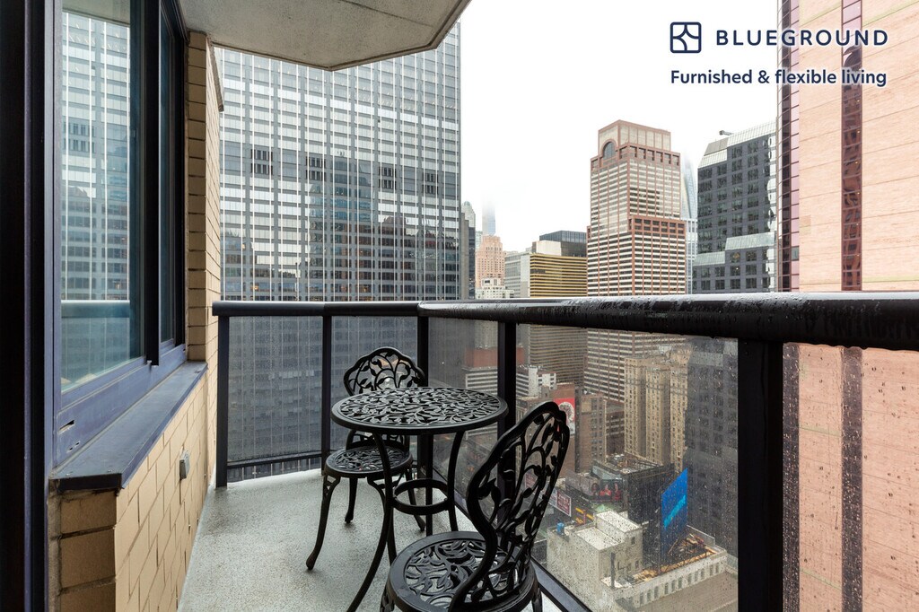 Discover the best of New York, with this one bedroom apartment in Theater District with balcony views over the city. It’ll be easy to simply show up and start living in this beautifully furnished apartment with its fully equipped kitchen, comfortable living room, and our dedicated, on-the-ground support. (ID #NYC50) The advertised rate of $5,720/month is the lowest available price, based on a 11 month(s) and 22 day(s) stay with a move-in date of February 9, 2026. Rates vary depending on the duration of stay, season, and other parameters. For exact pricing and additional pricing components, please visit our website and enter your desired move-in and move-out dates. The rate is applicable when billed upfront; it can be higher if billed in multiple payments. Brokers are welcome to reach out. Were you looking for an unfurnished lease? Try Blueground instead and upgrade from unfurnished to furnished living: - Furnished at rates comparable to unfurnished - No setup or furniture costs - save thousands - Move-in ready - save time, just bring your suitcase Designed with you in mind Gorgeous furniture, fully equipped kitchen, smart TV, and a premium wireless speaker are just a few of the amenities you’ll find inside this one bedroom apartment. Ideally located in New York, you’ll find a lot to love outside as well. When you’re ready to relax, you’ll be happy to discover every Blueground bedroom comes with superior quality mattresses, luxury linens, and cozy towels. We handle everything so you can simply show up and start living. Sleeping arrangements King Bed, 70.8in/180cm Amenities Building amenities unique to this one bedroom apartment include an on-site: - Doorman - Dryer in building - Elevator - Washing machine in building - Lounge - Pets allowed Arrival and ongoing support The entire apartment is yours to enjoy! Throughout your stay, you’ll have access to our Client Experience team through the Blueground App. You can schedule additional cleanings, submit maintenance requests, and view our neighborhood recommendations with just a few taps. We’ll share all details upon confirmation of your stay. Other things to note Building amenities may have an extra cost. This Blueground apartment has flexible lease options, allowing you to book it for one month, a year, or more. Pets are welcome, though weight limits and breed restrictions apply and may incur fees. Brokes CYOF. We take great pride in ensuring every photo displayed is shot in our own units with our actual furnishings. That said, we regularly refresh our decor and furniture arrangement, which may differ from what’s pictured. Also note - Other apartments in this building are undergoing renovations, and you may hear construction noise inside your apartment from time to time [SI]
