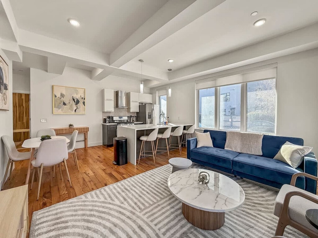 Welcome to this cozy two-bedroom haven, perfectly situated in Philadelphia’s vibrant Northern Liberties neighborhood. Known for its eclectic charm and energetic atmosphere, Northern Liberties boasts a thriving community with bustling cafes, unique boutiques, and a rich calendar of events. From local art galleries and live music venues to delicious eateries and lively beer gardens, this dynamic area offers something special for every visitor. This beautifully designed two-bedroom apartment offers a perfect blend of comfort and style, ideal for families, friends, or business travelers looking to explore Philadelphia. As you step inside, you'll be greeted by a bright, open living area filled with natural light, providing a warm and inviting atmosphere for relaxation. The modern décor and thoughtful layout create an ideal space to unwind after a day of sightseeing. A comfortable sofa bed in the living room provides additional sleeping space for extra guests. The primary bedroom features a plush queen-sized bed, ideal for restful nights and ultimate relaxation. The room is spacious, with a calming ambiance and ample storage for your belongings. The second bedroom offers two comfortable full-sized beds, perfect for accommodating additional guests or creating a flexible sleeping arrangement. This room is equally inviting, with a clean and modern design. Step into a stylish and functional kitchen designed to meet all your culinary needs. Outfitted with stainless steel appliances, including a refrigerator, oven, microwave, and dishwasher, ensuring a seamless cooking experience. Both bathrooms feature modern fixtures and spacious bathtubs, perfect for a soothing soak after a long day. Thoughtfully designed with sleek vanities, ample lighting, and contemporary tilework to create a clean and inviting space. Pets are allowed depending on size. A pet cleaning fee applies: $25 per night for 1-4 nights, $200 for 5-29 nights, and $300 for 30+ nights. Located in the heart of Northern Liberties, the apartment offers easy access to public transportation, allowing you to explore Philly’s historic landmarks, museums, and vibrant nightlife with ease. Whether you're here for business or leisure, this two-bedroom apartment is your perfect base for discovering Philadelphia. Smoking is strictly prohibited inside the property. A cleaning fee of $500 will be charged for any violation. Check-in time is after 4 PM, and check-out time is by 10 AM. Late check-outs without prior approval will incur additional charges. Please dispose of garbage in the designated bins and do not leave trash outside the unit to avoid attracting pests. Treat the property and its contents with respect. Any damages will be charged to the guest. [SI]