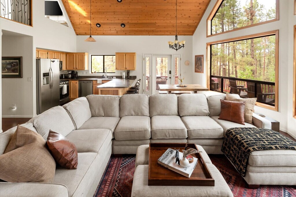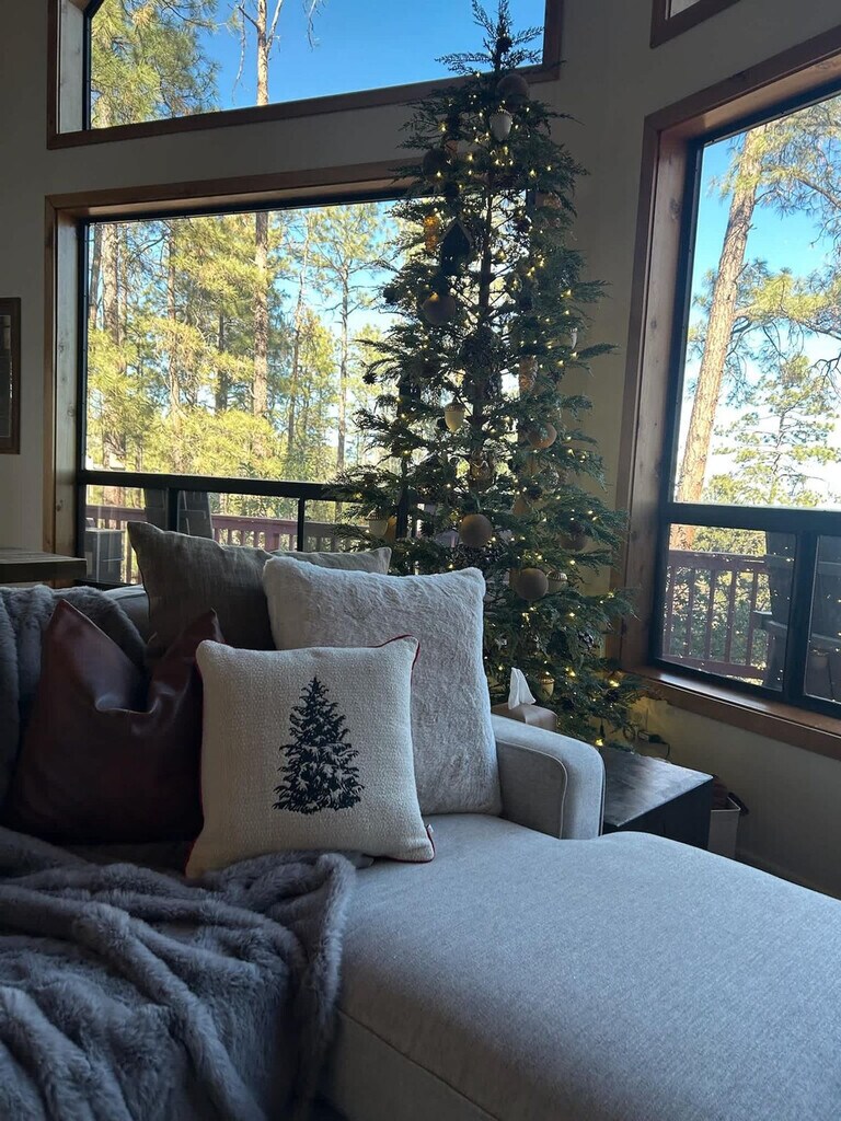 Feel at home in The Laurel Home, a 3-bedroom cabin in Prescott, AZ, that comfortably accommodates up to 7 guests. This 2-level cabin blends rustic charm with thoughtful amenities for a memorable getaway. This cabin features a fully stocked chef’s kitchen with high-end stainless appliances, a large refrigerator, ample cabinetry, a large island with high seating, and a coffee maker (drip and French press). The living room includes a 50” smart TV and a large plush sofa. Enjoy outdoor amenities such as an expansive deck with stunning views, a hot tub, a fire pit, an outdoor patio/dining area, a BBQ grill, and a corn hole game. Up to 2 dogs are allowed for $125 per stay, no cats please. Nearby attractions include Watson Lake (Granite Dells) about 7 miles away, Lynx Lake about 8 miles away, Sharlot Hall Museum about 4 miles away, Whiskey Row (Downtown Prescott) about 4 miles away, and Heritage Park Zoological Sanctuary about 8 miles away. For dining, visit Farm Provisions, Atmesfir, Rosa’s Pizzeria, El Gato Azul, Bill’s Pizza, The Barley Hound, or Palace Restaurant & Saloon, all about 4 miles away. Renting a car is a convenient option to explore the area. Check-in is at 4pm and check-out is at 10am. No parties are allowed and violations may result in immediate termination of the stay. Guests must be 25 years or older to book this property. Includes a dedicated workspace in bedroom 1. [SI]