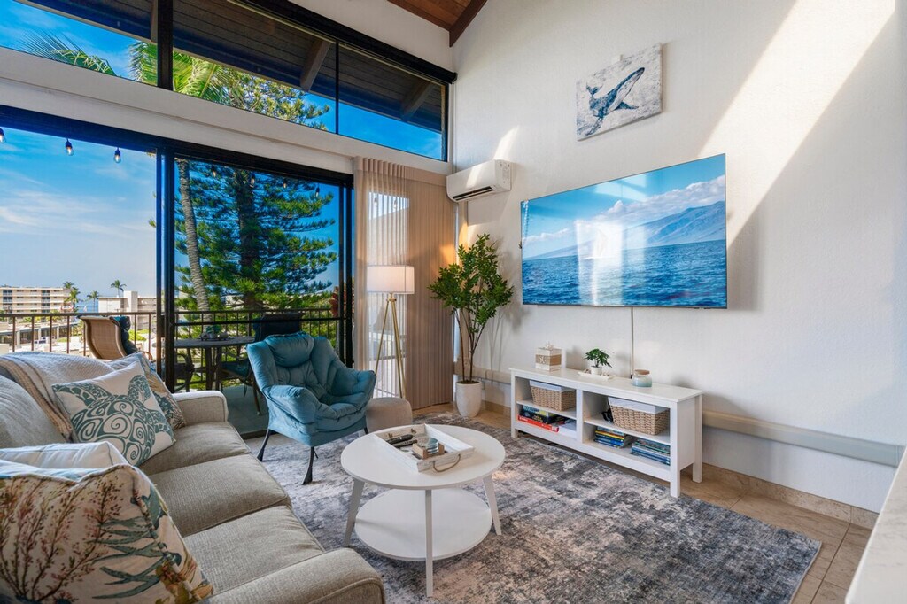 Feel at home in this beautifully updated 1-bedroom, 1-bath penthouse with a loft, offering ocean and mountain views just steps from the beach. Located on the top floor and accessible by elevator with a short staircase of 10 steps leading to the elevator, this condo boasts a fresh, modern ocean vibe. This open loft-style condo features vaulted ceilings with exposed wood beams. The living room includes a queen-size sleeper sofa and a 75” Samsung Smart TV. The kitchen is equipped with quartz countertops and stainless steel appliances, along with a Keurig coffee machine, drip coffee maker, and a hot water kettle. The main-floor bedroom has a king-size bed and another Smart TV, and the remodeled bathroom features a Toto Washlet and a walk-in shower. Upstairs, the open loft bedroom includes a second king-size bed and stunning ocean views. An in-unit washer and dryer with detergent are provided. Guests enjoy access to resort-style amenities, including a heated pool, hot tub, BBQ grills, pickleball, shuffleboard, beautifully maintained tropical gardens, and free guest parking. Situated in the heart of South Kihei, this condo is just steps from Kamaole Beach I, top-rated restaurants, and boutique shopping. Kihei is perfect for swimming, snorkeling, and watching spectacular sunsets. With its central location, you can easily access other parts of the island, such as Lahaina and West Maui. This is not a pet-friendly home, and there is a $500 fine for unauthorized pets. Strictly no parties and events are allowed, and quiet hours are between 9 pm and 8 am. There is no smoking or vaping of any kind allowed anywhere on the property, including outdoor areas, and no shoes are allowed in the home. There is a $500 fine per violation. Registration Number: 39, TA--01 [SI]