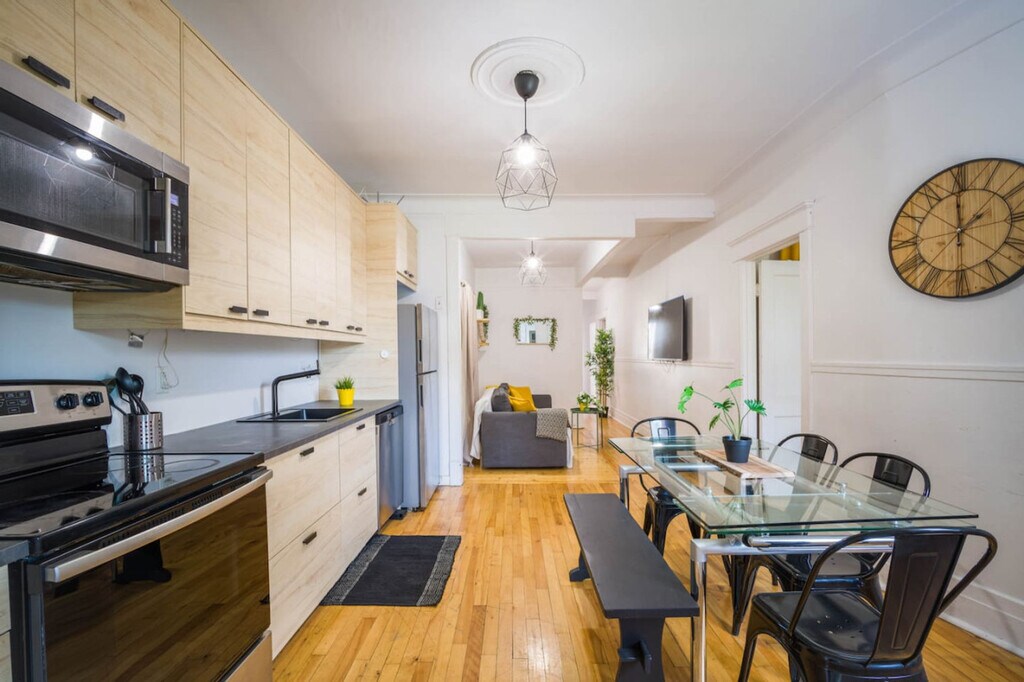 Welcome to this bright, fully renovated 4-room apartment located in one of Montréal’s most vibrant neighborhoods, just a 5-minute walk from Frontenac metro station. With over 1000 sq. ft. of space, this stylish and well-appointed unit is ideal for international students, remote workers, families, or travelers seeking both comfort and convenience. The apartment is located on the second floor, approximately 20 stairs up, and is accessible via a main building entrance and private apartment door. The apartment includes three private bedrooms with high-quality double beds, a large dining area perfect for meals or work, a cozy living room with a smart TV, and a fully equipped kitchen with modern appliances and a dishwasher. A wall-mounted air conditioner keeps the space cool in summer, and the renovated bathroom adds extra comfort. Guests will also enjoy high-speed Wi-Fi, self check-in via lockbox or smart lock, and support from our team from 8 AM to 8 PM, with emergency assistance available 24/7. Everything you need is close by, including cafés, bakeries, restaurants, cultural centers, green spaces, and public transport. Whether you’re visiting Montréal for business or leisure, this apartment is a welcoming, stylish, and practical choice. It offers quick access to downtown, Old Montréal, Plateau, and the Botanical Garden, and is just a 5-minute walk to Frontenac metro station. The balcony is currently under renovation and not accessible during your stay. No pets are allowed, and service animals require prior approval, subject to an automatic surcharge penalty of $300 per pet if not honored. Quiet hours are from 10 PM to 7 AM, and there is a no-smoking and no-parties policy. If the number of people exceeds the number registered initially, without notice to the landlord, a fee of $70 per person per day will apply automatically. Breakage and damage must be reported to the landlord as soon as possible. Registration Number: 318917 [SI]