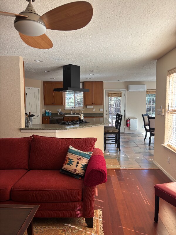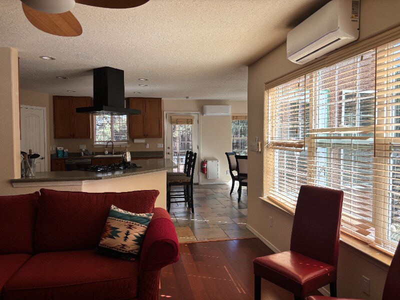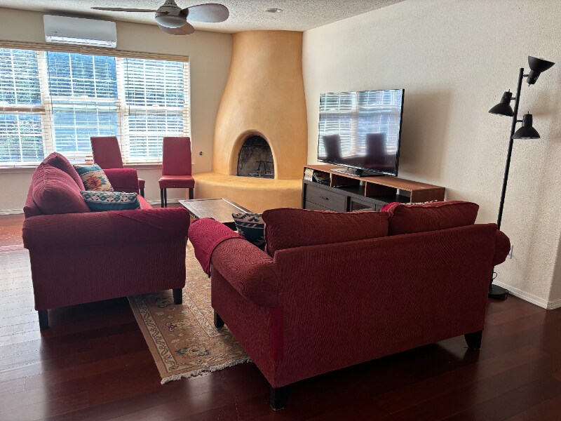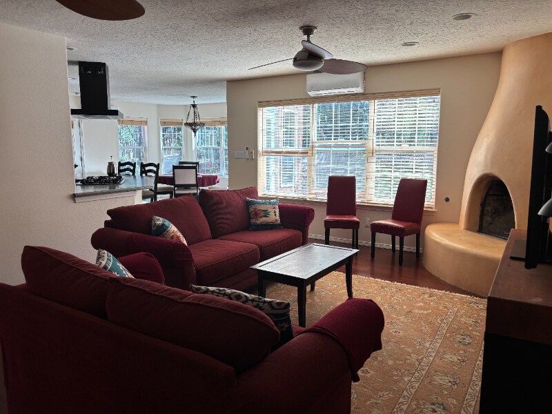 Property Id: 1476252 Tucked into the woods in the foothills of the Sandia Mountains, and just minutes off of I-40, Historic Route 66, and the Turquoise Trail. The Space: Semi-Furnished with southwest-style decor. **SEMI-Furnished** Feel at home in this quiet, private space. There is an open floor plan in the main living space with a kitchen and dining area. Wifi is available throughout the home. In the kitchen, you'll find a refrigerator, a stove, and a dishwasher. In the dining room, find a 4 seater dining table with extendable leaf for additional guests. In the living room, find two red sofas, chairs, coffee table and area rug. Windows to the backyard surrounded by woods makes this space very private. You can access the large bedrooms, both with a bathroom. The Master Bathroom has both a shower & tub. Lots of storage and closet space. Sleep comfortably on a king-size bed. Parking for three vehicles out front.