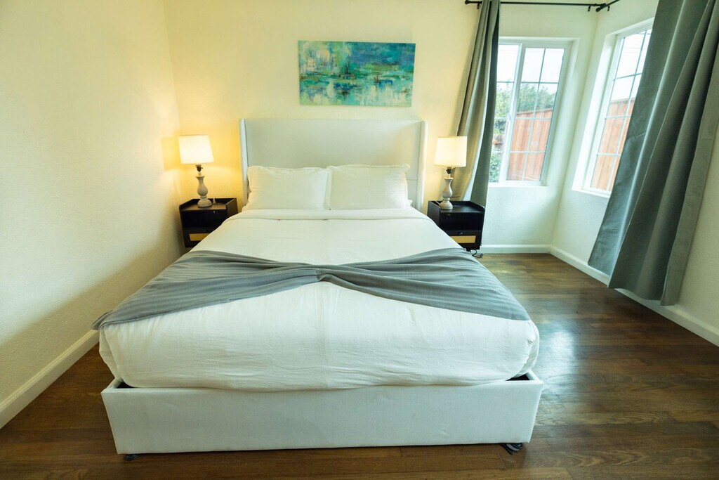 The advertised rate of $5,429/month is the lowest available price, based on a 1 month(s) stay with a move-in date of April 7, 2026. Rates vary depending on the duration of stay, season, and other parameters. For exact pricing and additional pricing components, please visit our website and enter your desired move-in and move-out dates. The rate is applicable when billed upfront; it can be higher if billed in multiple payments. Feel at home in this modern 2-bedroom home located in the heart of San Jose’s historic Japantown. This comfortable home is ideal for business travelers, remote workers, and families looking for convenience and comfort. The fully equipped kitchen has everything you need for cooking and dining, from the essentials to modern conveniences, including a Hamilton Beach coffee maker, Keurig coffee maker, teapot, air fryer, and blender. Unwind in the bright living space featuring a Smart TV with streaming capabilities. This home also features central heating and AC and bright and modern furniture throughout. Located in a vibrant, urban neighborhood in the heart of Japantown, San Jose, this home is part of Silicon Valley and just minutes from downtown San Jose. You can reach a wide variety of restaurants, including gourmet American cuisine, Italian pasta, Mexican burritos, Vietnamese pho, and longstanding Chinese noodle houses, all within a short drive. You're also close to local Asian seafood markets, fresh sushi spots, and even Korean BBQ. Popular destinations like Santana Row are only about a 12-minute drive away. This home is 2.6 miles from SJC Airport, 3.0 miles from Diridon Station (VTA & Light Rail), 2.1 miles from the San Jose McEnery Convention Center, and 1.6 miles from San Jose State University. It's also just a 3-minute drive to Japantown and offers quick access to major tech companies like Adobe, Zoom, Cisco, eBay, and NVIDIA. The indoor fireplace is decorative only. For parking, you can use the driveway, or there is abundant street parking available nearby. Includes an adjustable-height study desk. [SI]