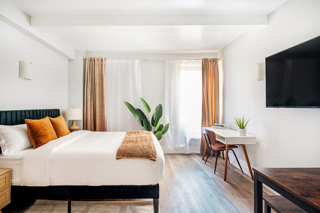 Welcome to The Tempo, a distinguished elevator doorman building situated in the heart of the Upper West Side. Nestled just one block away from the West 72nd Street express subway station, this prime location positions the apartment conveniently between the scenic Riverside and Central Park. The Tempo offers a 24-hour attended lobby, a fully equipped gym, and a laundry room for your convenience. Welcome to this beautifully remodeled studio, designed for both comfort and convenience. Located on the 4th floor, this fully furnished space features refinished hardwood floors, multiple windows for natural light, and a closet for your storage needs. The modern kitchen boasts great cabinet space, a full-size refrigerator, and all the essentials to prepare meals and snacks. Relax in the cozy living area, complete with a comfortable couch, a 50” Smart HDTV, Wi-Fi, and air conditioning for the summer months. The queen-size bed with a plush memory foam mattress ensures a restful night's sleep, while the modern bathroom adds a touch of elegance. This stylish studio is perfect for those seeking a hassle-free, move-in-ready experience. Just bring your suitcase and settle in! Nestled between two picturesque parks, the Upper West Side stands out as one of Manhattan's lushest neighborhoods. Its enduring popularity can be attributed to its exceptional elementary schools, secure streets, and vibrant atmosphere. The Upper West Side exudes an air of tranquility, yet it's far from monotonous. Along Amsterdam Avenue, you'll discover a plethora of cozy bars and eateries, while Broadway pulsates as a perpetual hub of commerce. This neighborhood's broad, tree-lined avenues still house numerous cherished mom-and-pop shops. While it may not possess the opulence of the Upper East Side, the Upper West Side offers superior accessibility via public transportation. The apartment is under a mile from the 1, 2, 3, B, and C trains at 72nd Street station. New York City's heating season is until the end of May. Beginning around mid-April, window air conditioning will be installed in the apartment. You can request an earlier installation if needed. [SI]