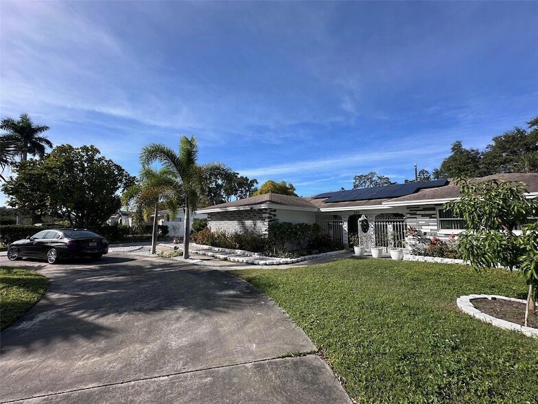 Sprawling rental home - FURNISHED - on a beautiful area of 26th Ave South. The approach into the property is highly impressionable with tall palm trees on 26th, and a long semicircle driveway accommodating up to six vehicles centered by tropical Bismarck palm. 2-car garage. Solar panels for LOWER ELECTRICITY BILLS! Kitchen enthusiasts will appreciate this one with an abundance of custom cabinetry, granite countertops with integrated backsplash, and eat-in bar for grabbing a quick convenient bite. Two living rooms to which you can designate functionality as you wish with the main featuring an 85" Samsung OLED Smart TV. Front porch and back enclosed lanai with oversized fenced-in backyard. Terrific for any pups that would like to come along & enjoy the secure 10,000sf lot! Pet-friendly with Ring security system optionally available for your use. Located within a mile from Lake Maggiore & St. Pete County Club for terrific walkability. The combined indoor & outdoor utility of this home is hard to find, and the next tenant will be sure to enjoy! Nearly all furnishings pictured are included, but please inquire within for any exception requests or questions. Professionally managed.
