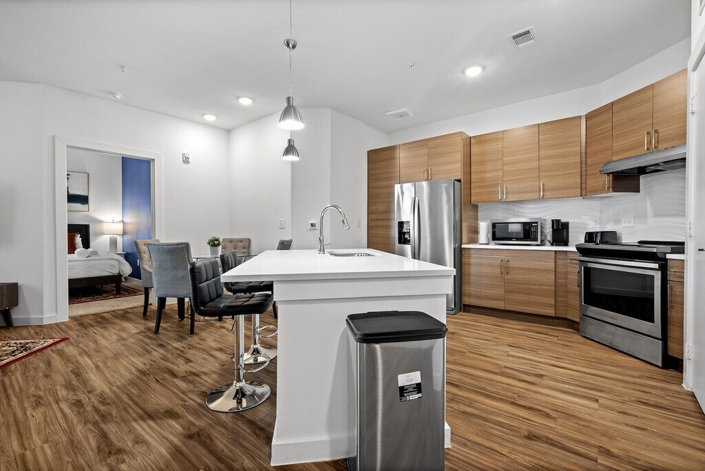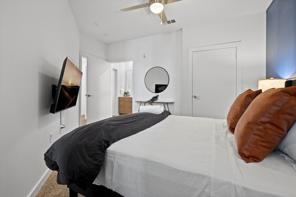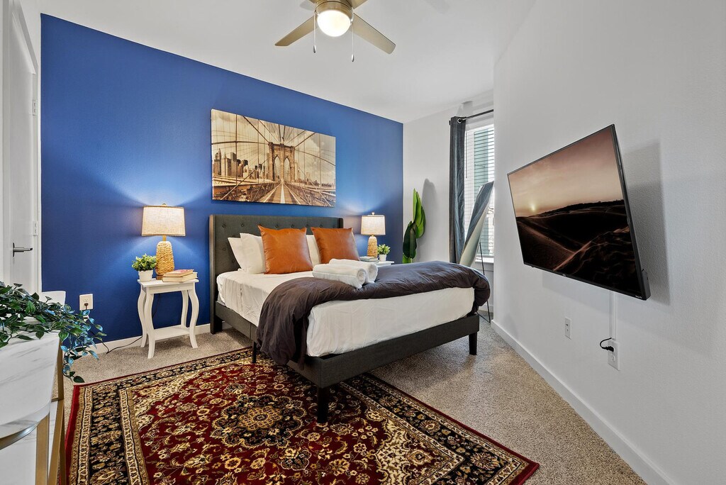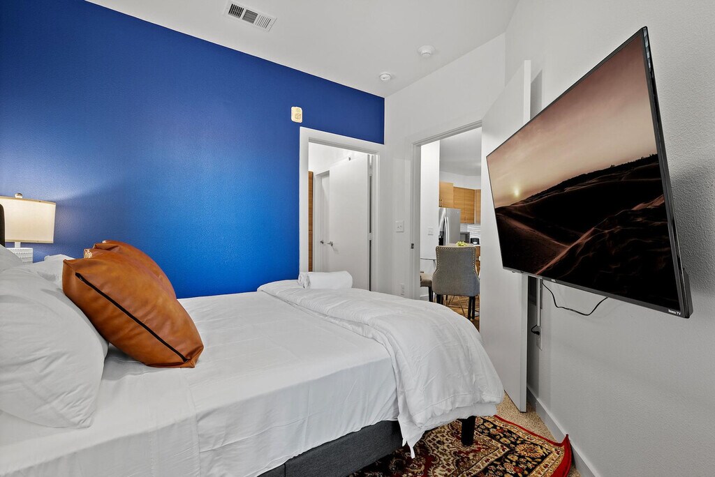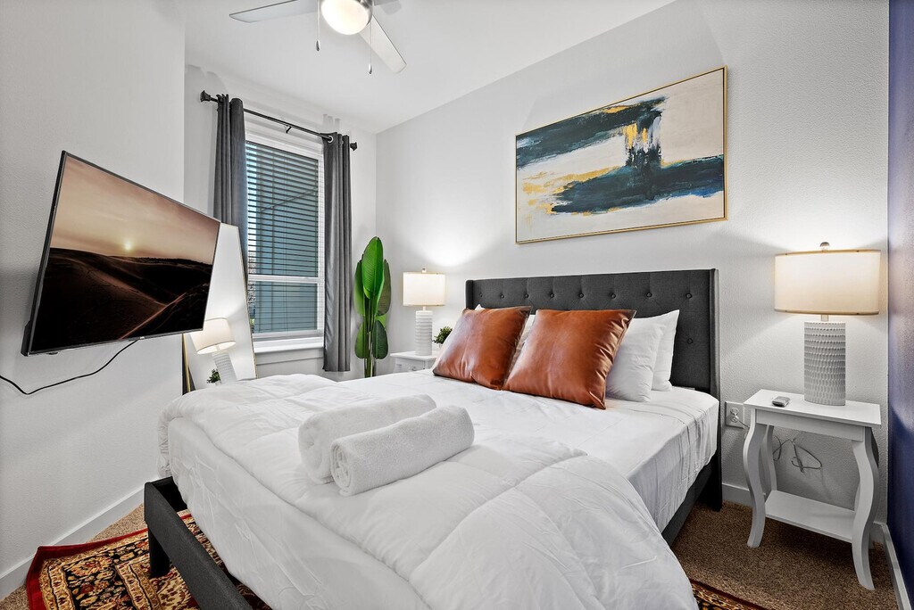 This inviting apartment is located in the Riverside area of Austin, just a short walk from the river and conveniently close to local attractions. Situated on the third floor, the apartment offers easy access with no stairs required. Feel at home in this well-appointed apartment featuring two queen beds and a full-size pull-out sofa bed, along with two full bathrooms. The fully equipped kitchen and in-unit washer and dryer add to the convenience, while self flexible check-in enhances your stay. A small gym in the building is also available for your fitness needs. Parking is available for one car only, with no trailers, RVs, or commercial vehicles allowed. Early check-in, late checkout, and room service may be available for a fee. Nestled in the Riverside area, this apartment is just 20 minutes walking from the river and minutes away from restaurants, grocery stores, and CVS. It's 2 miles from Rainey Street, 3 miles from the capital, and a 10-minute drive to the airport, making it an ideal location for exploring Austin. The apartment is subject to street noise due to its location. Smoking is not allowed, and any attempt to throw a party will result in immediate termination and charges. Pets and emotional support animals are not allowed. A doorbell camera is installed for security, and a copy of your ID is required until checkout. Reservations will be canceled if you have a violent criminal history. [SI]