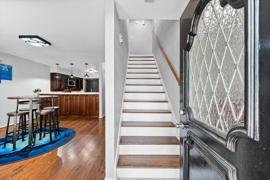 Highly desirable subdivision located in cul-de-sac. This is a gem with MULTIPLE primary bedrooms and all 3 rooms have walk-in closets and adjoining FULL bathrooms so all could function as a primary. Updates galore with aspects of unique charm! All 3 bathrooms renovated with primary upstairs features one-of-a-kind oversized rainfall shower along with floating tub and extremely spacious walk-in closet. Floor to ceiling custom stacked rocks with sitting area cover one side of living room. Pull up to the breakfast bar with floating lights leading into kitchen or perhaps enjoy a beverage from the custom bar area with metallic blue backsplash and floating shelves. Natural light emits through updated windows and plantation shutters. Primary upstairs also includes sitting area and skylight. All of the closets are spacious for plenty of storage. Also this is one of few that has a 2 car GARAGE and connects to turfed enclosed and screened in back patio to keep the mosquitos out and enjoy the outdoors year-round! Close to restaurants, grocery, parks, and coffee. Comes with washer and dryer and some furniture negotiable. Grab this quick before someone else does!