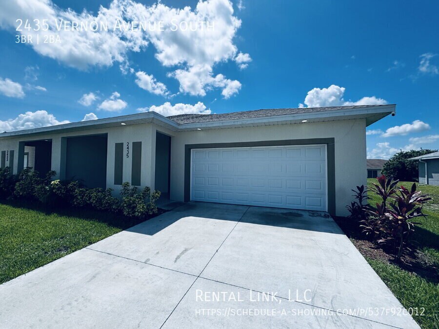 Experience luxury living in this newly constructed 2-bedroom, 2-bathroom rental with a spacious den that can easily double as a third bedroom, accompanied by a convenient two-car garage. Boasting expansive outdoor areas including generous front and back porches, this home invites relaxation and outdoor entertainment. Inside, vaulted ceilings throughout create an airy atmosphere, complementing the open concept kitchen and living room adorned with sleek granite countertops, stainless steel appliances, and elegant white shaker-style cabinets. Retreat to the master bedroom retreat, complete with a sprawling walk-in closet and a modern ensuite bathroom featuring a walk-in shower. The second bedroom and den offer ample space for living and versatility, with the den serving as an ideal guest room or home office. For added convenience, this residence comes fully equipped with all appliances, including a full-size washer and dryer, and features a rare two-car garage, a coveted amenity in Lehigh Acres duplexes. Plus, enjoy the ease of inclusive rent covering water, monthly water treatment, sewer, trash collection, and yard maintenance, ensuring a stress-free living experience. All Rental Link residents are enrolled in the Resident Benefits Package (RBP) for $50.00/month which includes renters insurance, HVAC air filter delivery (for applicable properties), credit building to help boost your credit score with timely rent payments, $1M Identity Protection, move-in concierge service making utility connection and home service setup a breeze during your move-in, our best-in-class resident rewards program, and much more! More details upon application.