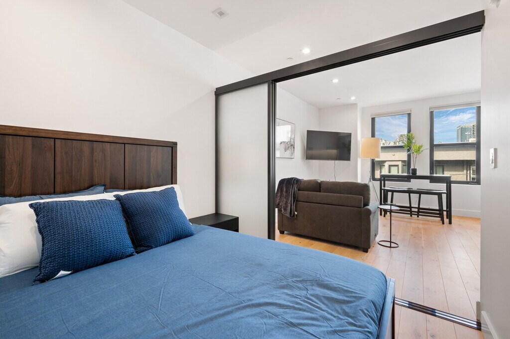 Welcome to 1801 Mission, a brand new building offering high-tech and luxury living in the heart of the vibrant Mission District. This 1-bedroom, 1-bathroom condo is designed for comfort and convenience, featuring radiant floor heating and high-end appliances like a Bosch stove and dishwasher. Located on the corner of 14th & Mission, this condo is just two blocks from BART and Valencia Street, known for its destination eateries, independent shops, and vibrant cultural scene. The condo boasts a spacious bedroom with blackout blinds, beautiful oak hardwood floors, and a kitchen equipped with a Bosch fridge with ice maker, Bosch dishwasher, and microwave. Enjoy the convenience of in-unit laundry and air conditioning, making it easy to feel at home. Parking is available for an additional $350 per month. Cats and dogs up to 45 lbs are welcome, with specific breed restrictions and a non-refundable pet charge or increased deposit required. A monthly pet charge also applies. Situated in the Inner Mission neighborhood, 1801 Mission is surrounded by some of San Francisco's best restaurants, music venues, and cultural events. With BART just two blocks away, commuting and exploring the city is a breeze. Valencia Street, a modern hub of the Mission District, is home to popular eateries, shops, and murals, offering a lively atmosphere right at your doorstep. The building features high-speed elevators, a bike room, a rooftop deck, and a dog run. Pets must be leashed at all times when outside the unit and are not allowed in common areas except to enter or exit the building. Please clean up after your pet, as a fine will be charged for non-compliance. Check-in and check-out times are flexible, and PG&E is covered up to $145 per month, with tenants responsible for any overage. Please note that a refundable security deposit of $1,000 is required and must be paid directly to the partner after the booking is confirmed.