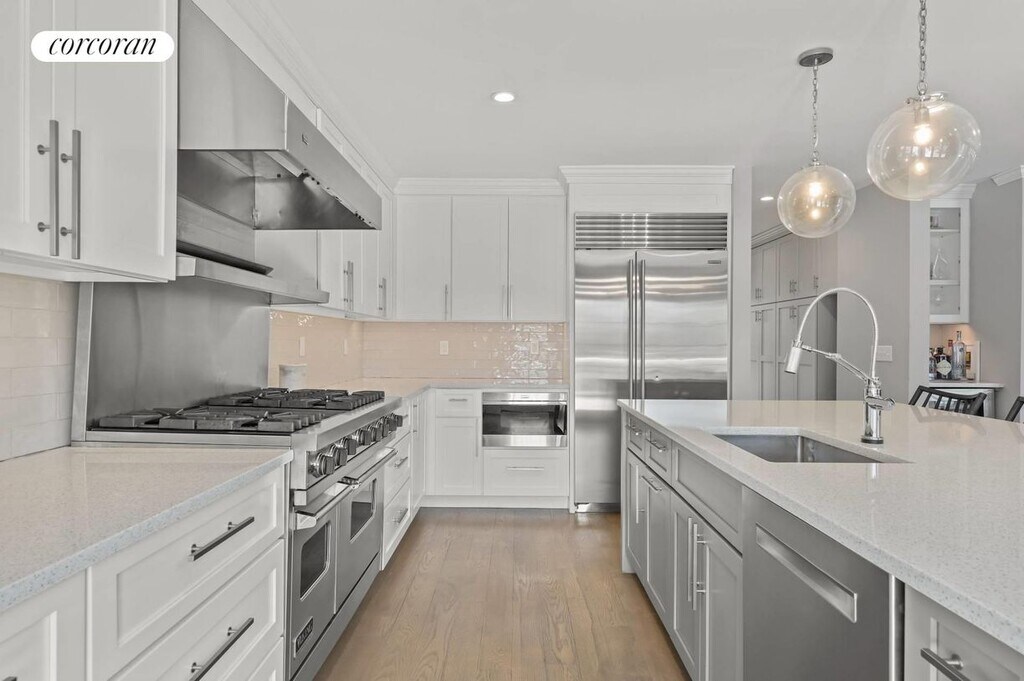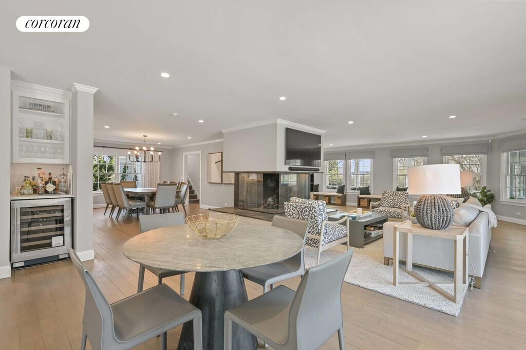 Enjoy a summer getaway at this fully renovated, three-story home in Westhampton Beach. With an open layout and functional living spaces, this property is designed for comfort and convenience. The first floor features a spacious foyer, a living room with fireplace, a sunroom with French doors to the back deck, a formal dining room, and a chef's eat-in kitchen with island seating for four and a breakfast nook. A mudroom with a full bath and laundry room adds practicality, while a bonus room with a private entrance offers flexibility as a home office or den. The second floor includes three bedrooms and three full baths, including two ensuite bedrooms. The primary suite has a private balcony, a bathroom with a double vanity, a walk-in shower, and a soaking tub. This floor also offers a family room with a wet bar, sectional seating, and a wall-mounted TV, along with a smaller den for added privacy. The third floor includes an additional bedroom, a full bath, and a sauna. Outside, the one-acre property includes a heated gunite pool, a back deck with lounge seating, dining for eight, and a Weber gas grill. The yard offers plenty of lawn space, a play set, and an outdoor shower. Additional amenities include central air conditioning, a one-car garage, and beach access (tenants must provide their own beach passes).