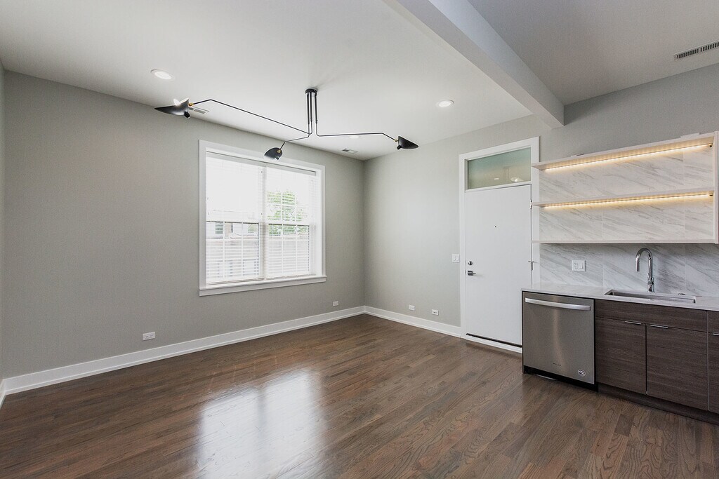 Fully Renovated, High-End 1 Bed / 1 Bath | Ukrainian Village | 650 ft² Experience modern living in this beautifully renovated 1-bedroom, 1-bathroom rear unit located in the heart of Ukrainian Village in Chicago. Meticulously updated in 2020 with premium finishes, this 650-square-foot home is part of an intimate 6-unit building and offers an abundance of natural light, stunning hardwood floors throughout, and a spacious open-concept layout. The living area flows effortlessly into a contemporary kitchen featuring sleek cabinetry, quartz countertops, a tiled backsplash, under-cabinet lighting, and stainless steel appliances—including a built-in microwave, dishwasher, and garbage disposal. The oversized, king-sized bedroom (15' x 13') includes custom closets and a private en suite bathroom, outfitted with stylish tile flooring, a floating vanity, an LED-lit mirror, and high-end fixtures. Additional upgrades include a smart digital thermostat for year-round comfort, water detectors for added peace of mind, and elegant, energy-efficient recessed LED lighting throughout. Central heating and cooling, along with an in-unit washer and dryer, provide convenience and comfort. A rear deck offers a peaceful outdoor space for relaxing. **Photos may represent a similar unit in the building**