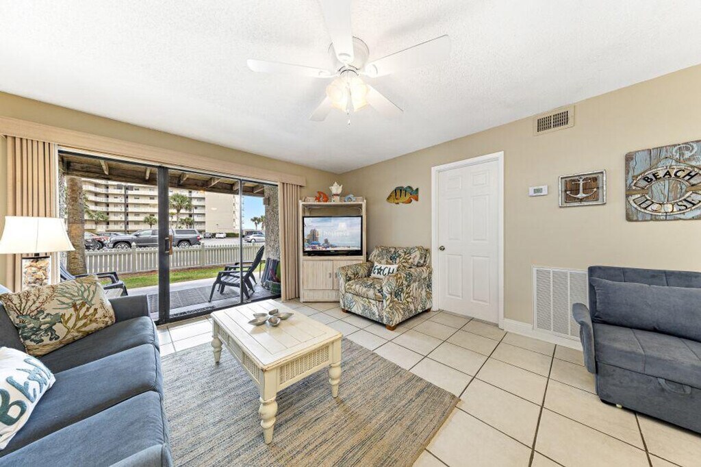 Seaside Beach and Racquet Club 2105 is a beautiful and spacious condominium located in a beachfront complex in Gulf Shores, Alabama. This fully furnished condo offers two bedrooms and two bathrooms, making it the perfect retreat for a family or a group of friends. The interior of the condo features modern furnishings and decorations, creating a welcoming and cozy atmosphere. The living room is equipped with a comfortable sofa and chairs and a flat-screen TV, making it a great place to gather. The kitchen is fully equipped with modern appliances, including a refrigerator, oven, microwave, and dishwasher, making it easy to prepare meals during your stay. There is also a private walk-out balcony that offers partial views of the Gulf of Mexico, making it the perfect spot to enjoy your morning coffee or watch the sunset in the evening. Additionally, the complex offers a range of amenities, including a beachfront pool, indoor pool, tennis courts, a fitness center, and easy access to the beach. The condo's interior boasts modern furnishings and decorations, creating a welcoming and cozy atmosphere. The living room is equipped with a comfortable sofa and chairs and a flat-screen TV, making it a great place to gather. The kitchen is fully equipped with modern appliances, including a refrigerator, oven, microwave, and dishwasher, making it easy to prepare meals during your stay. Parking passes are purchased at the guard shack on arrival. The cost is $50 per pass with a maximum of 2 passes per reservation. Payment by card only. Minutes away from top restaurants, great beach shopping, deep-sea fishing, watersports, and kid-friendly attractions like arcades, miniature golf, and amusement parks. A short drive to Pensacola for museums like Pensacola Naval Museum and other sightseeing adventures. The condo has a maximum occupancy of guests. Renters who exceed the occupancy limit are subject to eviction. Suitable for children and infants. No smoking in the unit or on the balcony. Any violation of the smoking policy will incur a $250 fine plus cleaning costs necessary to remove smoke odors. Quiet hours are observed from 10 pm to 8 am. Violators will be charged a $200 fine. The condominium association has a strict no-pets policy. This applies to emotional support animals as they are not covered by ADA. Only ADA-compliant service dogs are allowed according to Federal Law. No parties or events are allowed. Violators will be charged a $500 fine. For same-day late check-ins, you need to get the host's approval before booking. A state identification card or driver's license copy will be requested upon booking. A security camera/recording device is installed outside for your safety and protection. Surveillance cameras are not inside any of our properties. Beach towels are not provided. From March 1st to May 1st, the minimum age requirement for check-in is 25 years old. The traveler must be at least 22 years of age to make a reservation. We are not responsible for any accidents, injuries, or stolen or damaged items that occur while on the premises, its facilities, or parking lots. [SI]