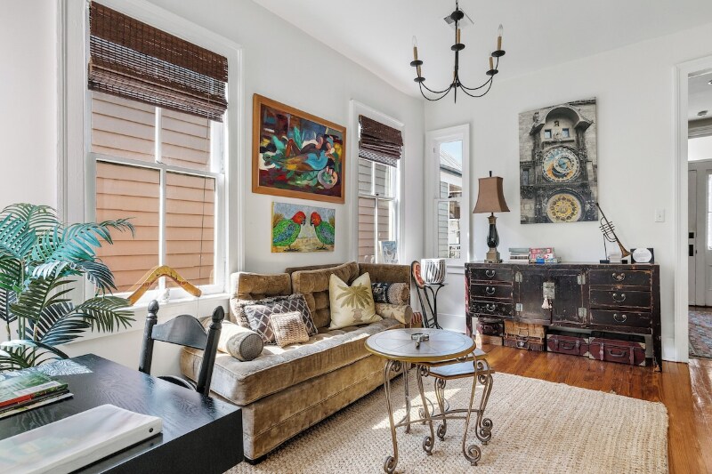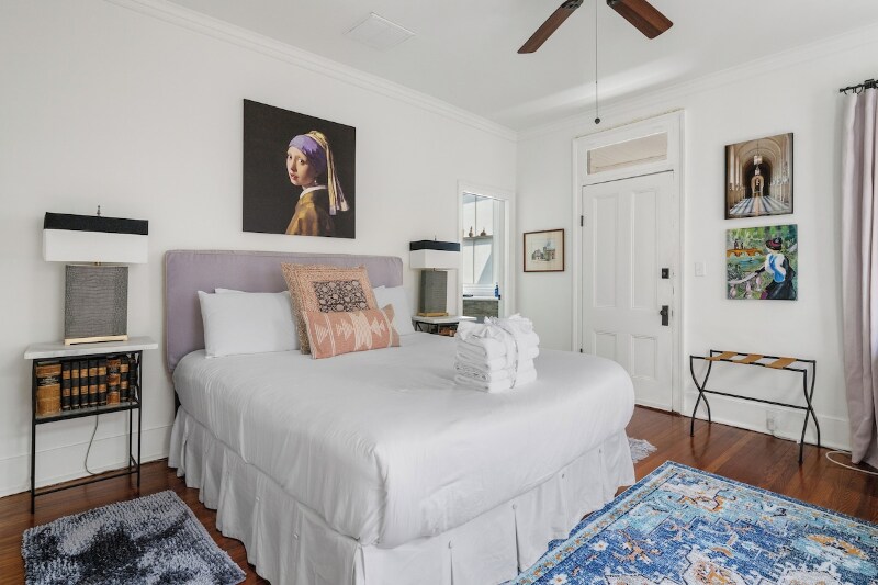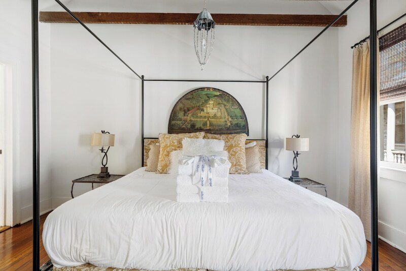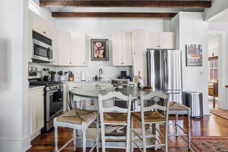 Property Id: 2236172 Head upstairs to the main living room and open kitchen, where vaulted ceilings soar overhead and highlight original exposed beams. A comfortable seating area is perfect for entertaining or catching up on your favorite shows on the Smart TV. The fully equipped kitchen offers countertop seating for four, and the front porch is the perfect spot to enjoy your morning coffee. Through the beautiful office/second living room, you'll come to the two spacious bedrooms. The first bedroom includes a king-sized poster bed, an original decorative fireplace and an ensuite bathroom with a single vanity and large walk-in shower. The second bedroom also offers a king-sized bed, as well as a Smart TV, a private back porch with seating for two and a large ensuite bathroom with a single vanity and shower/tub combination.