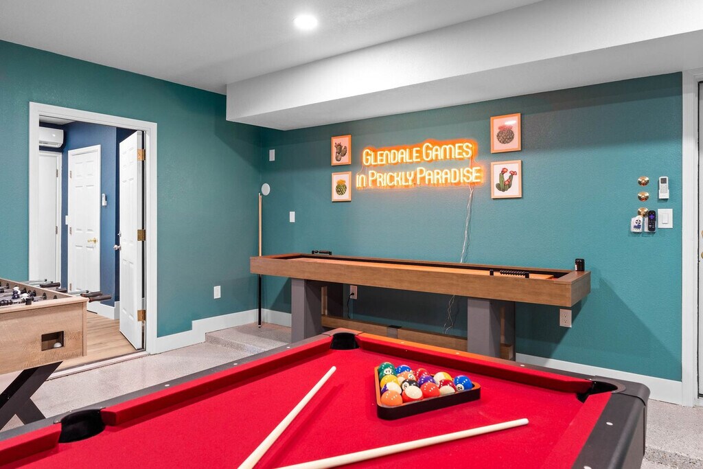 The advertised rate of $9,258/month is the lowest available price, based on a 30 day(s) stay with a move-in date of August 2, 2026. Rates vary depending on the duration of stay, season, and other parameters. For exact pricing and additional pricing components, please visit our website and enter your desired move-in and move-out dates. The rate is applicable when billed upfront; it can be higher if billed in multiple payments. Get ready for nonstop fun and feel at home in this spacious 5-bedroom, 3-bathroom Glendale home, comfortably accommodating up to 18 guests. This home is equipped with a sportcourt for basketball and pickleball, a private pool, a hot tub, a firepit, a movie theater, and a game room with foosball, shuffleboard, a pool table, board games, and arcade games. Enjoy outdoor activities with pool basketball, putt putt, corn hole, giant Jenga, and Connect 4. The fully stocked chef’s kitchen features high-end stainless appliances, ample cabinetry, a large island with high seating, and a coffee maker for both drip and Keurig coffee. The living room includes a 65” smart TV, a large leather sofa, plush seating, and an indoor fireplace. Up to 2 dogs are allowed for a fee of $125 per stay. Ideally located near top attractions, dining, and entertainment, this home offers the perfect balance of relaxation and fun. Nearby attractions include Thunderbird Conservation Park, Deer Valley Petroglyph Preserve, Adobe Mountain Desert Railroad Park, Sahuaro Ranch Park, and Breakthrough Smash Room. For dining, enjoy Macayo’s Mexican Food, Pei Wei Asian Diner, Pacific Seafood Buffet, Great Papa’s Gyro, and Panda Express. No parties are allowed, and violations may result in immediate termination of the stay. An exterior camera is installed solely to monitor the cleaning team for quality and security purposes. Parking is available for 3 vehicles in the driveway, and street parking is allowed as long as other driveways are not blocked. Guests must be 25 years or older to book this property. Check-in is at 4pm and check-out is at 10am. The pool is not heated, however it is naturally warm enough to swim in generally between June to September. Stays of 28 days or more may incur an additional cleaning fee. Guests are kindly asked that their dog is crate trained and that they pick up after their dog. Includes a dedicated workspace. Registration Number: STR-2026-000358 [SI]