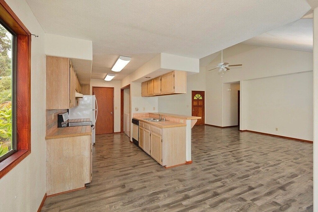 Property Id: 2421631 Welcome to your dream home in Hilo! This welcoming three bedroom, two bathroom home is fully fenced and beautifully landscaped with ocean horizon views. Inside laundry just off kitchen area. 2 car garage with room for storage. The great room's vaulted ceiling opens up the living area and dining space which look out to a hapu'u fern and anthurium garden. Enjoy the fenced yard, hardwood floors, and security features. Pets welcome! Don't miss out on this gem.