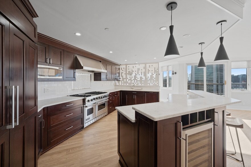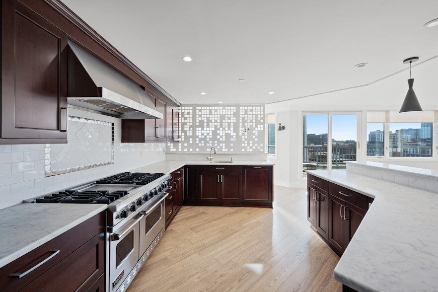 Experience elevated city living in this exquisite penthouse at The Classic, one of Stamford's most sought-after addresses. Spanning 2,113 square feet, this residence is bathed in natural light from sunrise to sunset and offers breathtaking city views from every angle. Savor spectacular sunsets from any of the three spacious private balconies. Perfectly situated in the heart of downtown Stamford, this pet-friendly building offers premier amenities including a private dog park, 24/7 concierge, shuttle to the train, glass-enclosed rooftop pool, fitness center, BBQ and picnic area, and a resident club room. Inside, the open-concept floor plan highlights floor-to-ceiling windows framing panoramic views, a designer kitchen with Carrera marble countertops, and professional-grade Viking and Sub-Zero appliances with bar seating. Rent includes gas, water, sewer, two deeded parking spaces, and full access to all building amenities. Just steps from shops, restaurants, theaters, parks, and the beach, this penthouse defines luxury and convenience-city living at its finest.