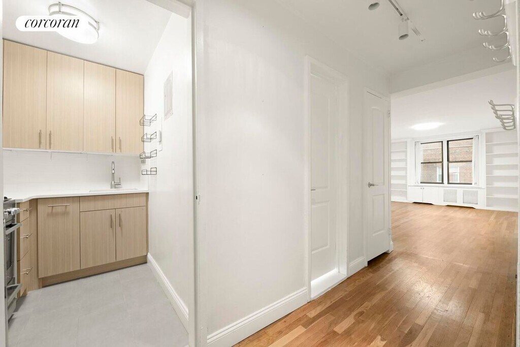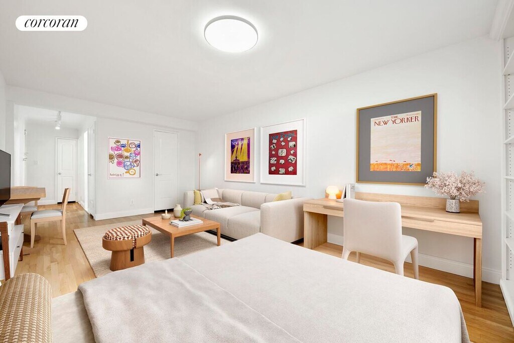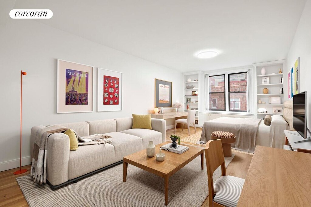 Greenwich Village - Top-Floor Corner GemExperience refined downtown living in this beautifully renovated, oversized corner residence on the top floor of the highly sought-after Montparnasse cooperative. Bathed in brilliant southern light and offering serene open Village views, Residence 6ON is a rare offering that blends privacy, smart design, and an unbeatable location between Fifth and Sixth Avenues.From the moment you enter, the home showcases modern sophistication. Recently renovated, it features rich hardwood floors, sleek new doors and baseboards, designer lighting, and a fully upgraded electrical system. The spacious, airy layout provides distinct zones for living, dining, and a dedicated home office-an ideal backdrop for your personal style.The kitchen is appointed with contemporary cabinetry, a clean white tile backsplash, and stainless steel appliances. The bathroom has been elegantly reimagined with a glass-enclosed walk-in shower. Exceptional storage includes a custom Elfa system and a true walk-in closet-an uncommon luxury in a studio-along with built-in bookshelves and custom cabinetry. A through-wall A/C unit ensures year-round comfort.Montparnasse offers a full suite of amenities, including a 24-hour doorman, central laundry room, meticulously maintained communal garden, complimentary bike storage, additional private storage for rent, and an on-site parking garage. Guarantors are permitted. Cats are welcome; sorry, dogs are not. Ideally positioned between Union Square and the West Village, the building places you moments from world-class dining, shopping, and cultural destinations, as well as major subway lines offering effortless access throughout Manhattan and beyond.$500 refundable move-in fee at submission $125 non-refundable background report fee at submission