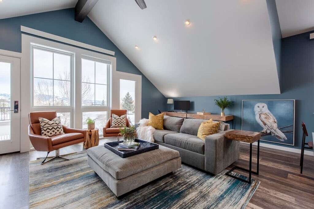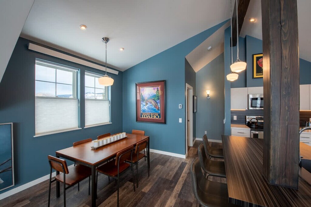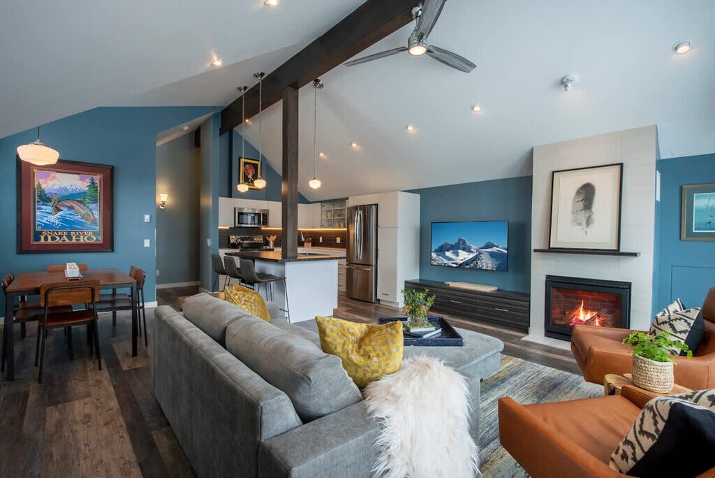 Experience the charm of the Teton Valley with this mountain modern townhome, built in 2020 and located just minutes on foot from downtown Victor. This home offers modern amenities while embracing the spirit of the valley, making it perfect for a weekend getaway to ski at any of the three nearby resorts, explore the valley, or work remotely with ease. This townhome features two bedrooms on the ground floor, with a king-size bed in the master and two twin beds in the second bedroom, each with a private bathroom. The open floor plan includes a well-equipped kitchen with bar seating for three and a dining table for six, complemented by brand new stainless steel appliances. The living room is furnished with a large loveseat, ottoman, two chairs, and rustic log-round end tables, centered around a gas fireplace and offering stunning views of the Big Hole mountain range through west-facing windows. Wi-Fi and a smart TV are available, along with a convenient work area for two. Located just minutes from downtown Victor, this townhome offers a convenient base for exploring the area. Enjoy easy access to shopping and dining, as well as proximity to national parks and ski resorts. Yellowstone's West Entrance is 1 hour and 49 minutes away, while Grand Teton is just a 43-minute drive. Regional airports are also within reach, with Idaho Falls, ID, 1 hour and 12 minutes away, and Jackson, WY, 50 minutes away. Guests are expected to treat the home with respect, adhering to rules such as quiet hours from 9 pm to 8 am, no events or parties, and no smoking or vaping in the home or on the decks. An additional charge will be applied if smoking evidence is found. Exterior lights should be turned off at night to preserve the dark skies. A maximum of two licensed vehicles is allowed in the driveway and garages. Fines, including a minimum $500 fine, may apply for violations such as smoking in the house, failure to follow house rules, or not vacating at check-out time.