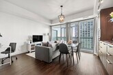 Located in the core of downtown on the 51st floor, feel at home in this beautiful 1-bedroom plus den condo with a balcony where you can enjoy the breathtaking lake view. This comfortable suite has everything you need to make you feel right at home, including a fully functional kitchen with supplies such as tea, coffee, a kettle, coffeemaker, and toaster. Enjoy entertainment with the smart TV, Netflix, and Wi-Fi. A washer and dryer with supplies are included, as is a bathroom with towels, shampoo, conditioner, body wash, a hair dryer, and other toiletries. Underground parking with in/out privileges is available upon request for an additional fee of $12.5 per night. It's recommended to request it in advance as spaces may be limited. If there is no availability, there is paid underground parking nearby. Pets are allowed in the apartment for a fee of $10 per pet per night. A travel crib (for babies 0-18 months) and bed rails are available for $5 per item per night; please book in advance. You'll be within walking distance of the Scotia Bank Arena, Union Station, Rogers Centre, CN Tower, Ripley's Aquarium, the Financial District, and hundreds of restaurants and bars. The Eaton Centre and Queen Street fashion district are also nearby, with easy access to the Subway and GO station. A grocery store, liquor store, banks, and all other necessities are within walking distance. According to the condo rules, information about all guests, including names, ID details, and vehicle and license plate numbers (if parking is required), must be provided to the condo management prior to arrival. Guests whose names or ID do not match the information given are not allowed into the building. If you do not agree to provide this information, a refund cannot be guaranteed. Registration Number: STR-2103-JBJRVM [SI]