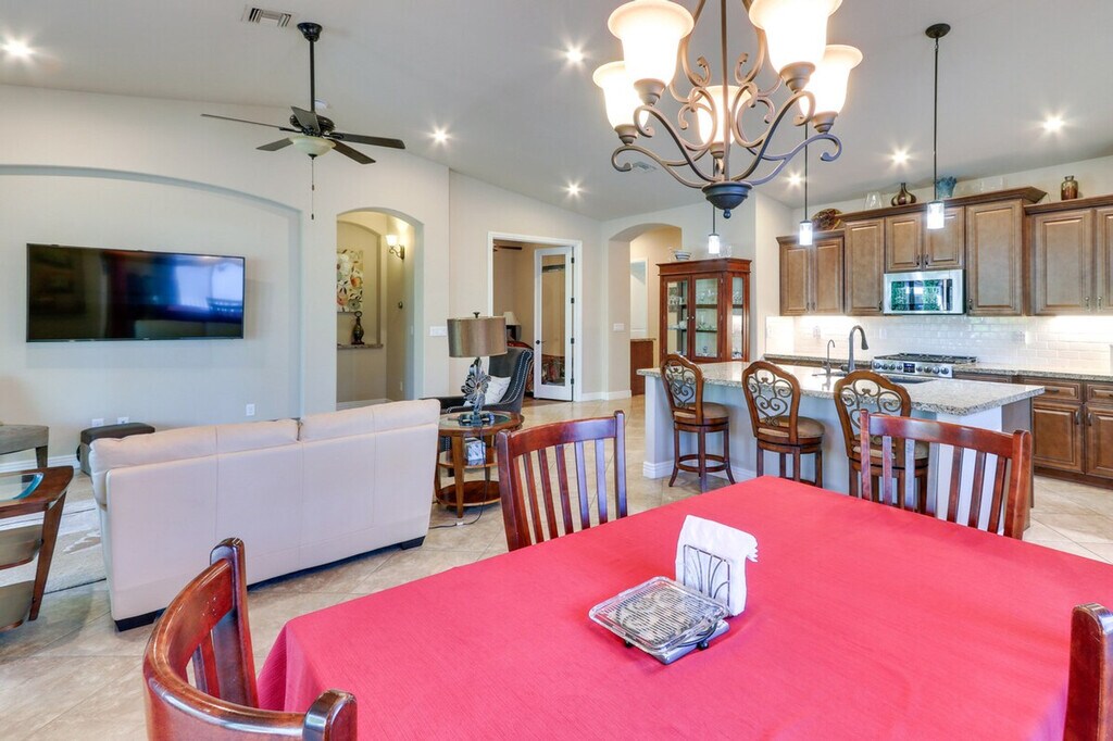 Feel at home in this 2-bedroom, 2-bathroom vacation rental in the Apache Wells community of Mesa, Arizona. This home is located in a 55+ community and is not suited for children. This home features a full kitchen equipped with a blender, coffee maker, cooking utensils, Crockpot, dishware and flatware, dishwasher, hot water pot, ice maker, microwave, spices, toaster, and water filter. You'll also find smart TVs, a dining table, vaulted ceilings, an office space, a washer and dryer, complimentary toiletries, a hair dryer, hangers, laundry detergent, an iron and board, linens and towels, trash bags, paper towels, central air conditioning and heating, free Wi-Fi, and keyless entry. Guests have access to a heated community pool, hot tub, fitness center, golf course, woodworking shop, outdoor kitchen with grills, picnic area, and tennis courts. Parking is available in the driveway for two vehicles, in the garage for two vehicles, and for RVs (3 days max). When you're ready to explore, consider hiking through the Riparian Preserve at Water Ranch or driving to Phoenix. Smoking, pets, events, parties, and large gatherings are not allowed. Guests must be at least 55 years old to book. Your safety matters; this property features two exterior security cameras: one Ring doorbell camera facing the street and one camera on the back patio facing the backyard. The cameras are outward facing and do not look into interior spaces and record video and sound when activated by motion. [SI]