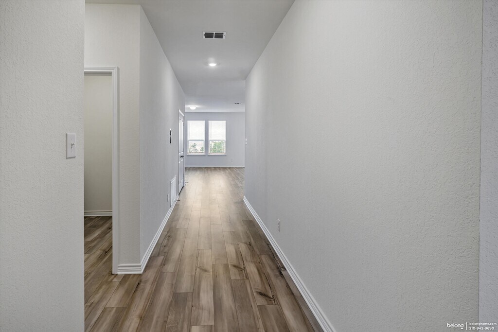 Come live in this beautifully crafted 3-bedroom, 2-bathroom home spanning 1,675 square feet in a serene, newly developed neighborhood in San Antonio, TX. Thoughtfully designed for both comfort and sophistication, it features elegant hardwood floors, modern amenities, and tasteful finishes throughout. Nine-foot ceilings on the first floor create an airy atmosphere. Woodmont Dakota shaker-style 42-inch upper cabinets and a chic Daltile tile backsplash adorn the kitchen. Silestone Miami White countertops and an extended breakfast bar complete this inviting culinary space. Meanwhile, a bonus room offers versatility, making it ideal as a TV room or studio to suit your lifestyle. Step outside to an expansive backyard where the absence of rear neighbors grants privacy and uninterrupted scenic views. Automatic sprinklers keeps the garden effortlessly vibrant. Additional features include a security system with motion detectors and alarm for peace of mind, along with smart home integrations that elevate your living experience. Located in a safe neighborhood known for excellent schools and proximity to public transit and essential services, this home is as practical as it is beautiful. Community amenities include a pool, picnic pavilion, and playground. The pet-friendly policies welcome up to two cats to join you in this lovely space. *Our homes come as-is with all essentials in working order. Want upgrades? Request it through the Belong app, and our trusted pros will take care of the rest!