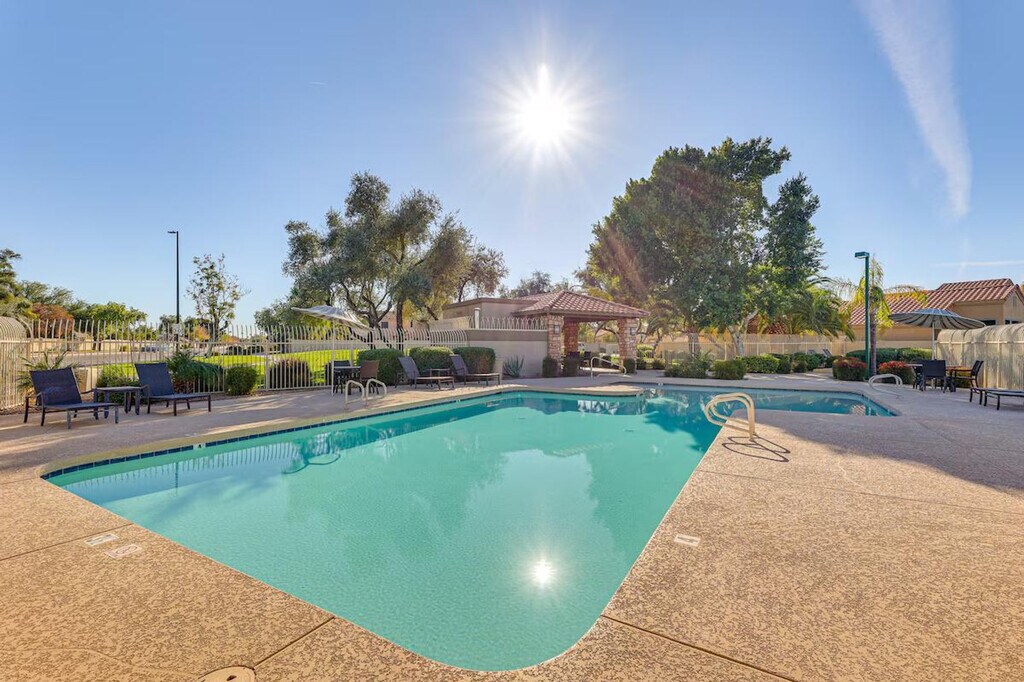 Experience the best of Gilbert, Arizona, during an extended stay at this 2-bedroom, 2-bath vacation rental where you'll feel at home. This single-story home requires one step to enter, and steps are required to access the lake from the patio. This home is in the Stone Bridge community, offering access to a heated community pool, hot tub, playground, lake, and walking trails. The kitchen is equipped with a stove/oven, refrigerator, microwave, dishwasher, drip coffee maker with a starter pack of coffee provided, and toaster, as well as cooking basics, trash bags/paper towels, and dishware and flatware. Enjoy the smart TV, gas fireplace, and dining table indoors, or relax on the patio with a wood-burning fireplace with wood provided and an outdoor kitchen with a gas grill. There are also 2 paddleboards available for your enjoyment. Additional amenities include central heating and A/C, a washer/dryer with a starter pack of laundry detergent, an iron and board, linens and towels, complimentary toiletries, a hair dryer, and keyless entry. Pets are welcome with a $50 fee, plus fees and taxes. This home offers a prime location with easy access to the Heritage District, Western Canal, and Sun Circle Bike Trail. When you're not relaxing poolside, grab a bite to eat downtown or take a day trip to Phoenix! Smoking, events, parties, and large gatherings are prohibited. Additional fees and taxes may apply, and a photo ID may be required upon check-in. [SI]