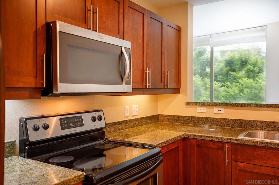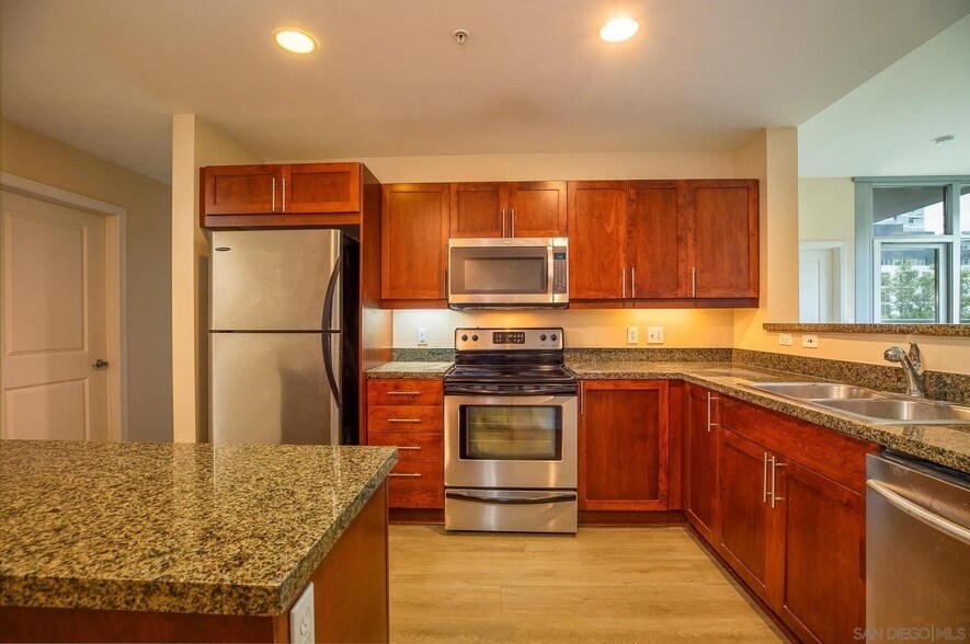 Prime location directly across the street from Petco Park. Enjoy the expansive wraparound patio, perfect for entertaining! Features include: elegant flooring throughout, granite countertops, stainless steel appliances, a large kitchen island, washer/dryer, and two side-by-side parking spaces. The spacious floor plan is filled with natural light. The complex offers a BBQ area, fitness center, and community room. Park Terrace is within walking distance of Gaslamp, the trolley station, waterfront, dining, and entertainment.