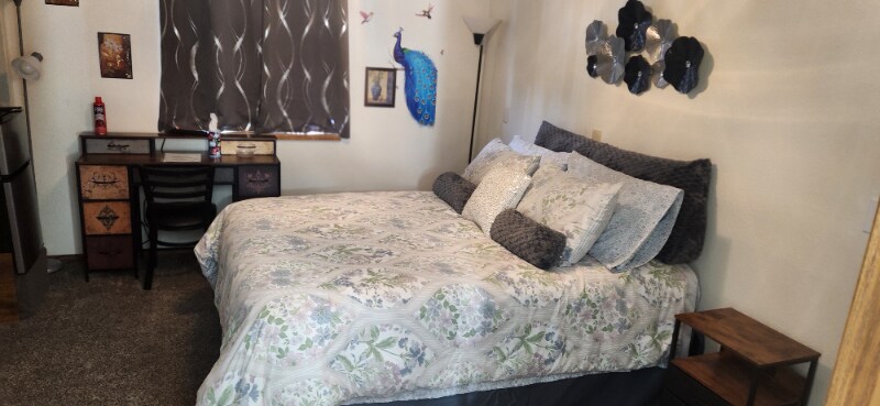 Property Id: 2219562 "This Lovely Spacious Space" is 1200sq.ft.... It features 3 fully furnished bedrooms, 2 bedrooms with Queen size beds, and one bedroom features a King size bed. Each bedroom has a microwave, mini fridge, coffee maker, 50" smart TV, work desk, portable fan and a portable heater...... 2 bedrooms share one full bathroom, that is centrally located between both bedrooms..... 1bedroom is a master queen suite, it has a large connected private bathroom with a double vanity sink..... You will also have access to the outside backyard patio.....