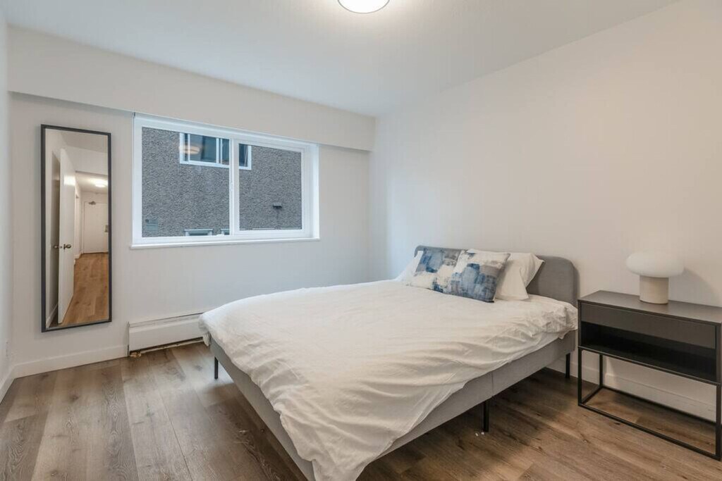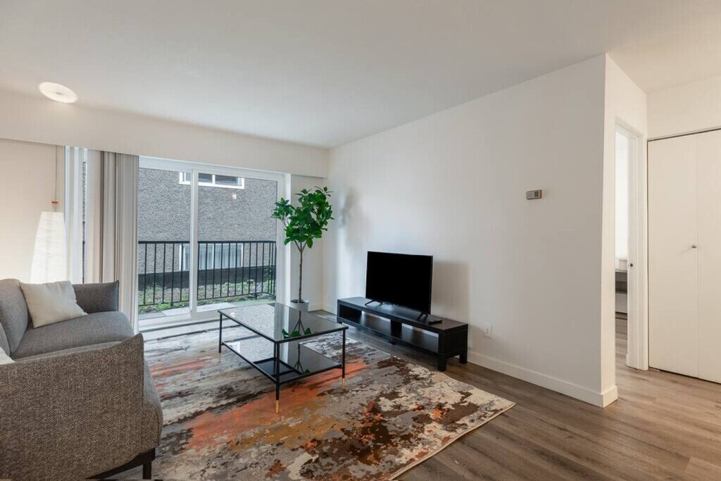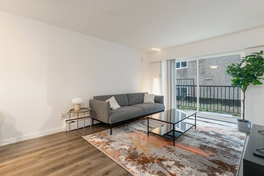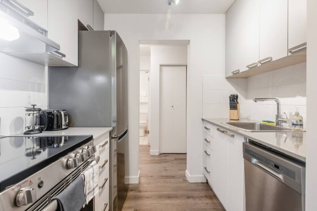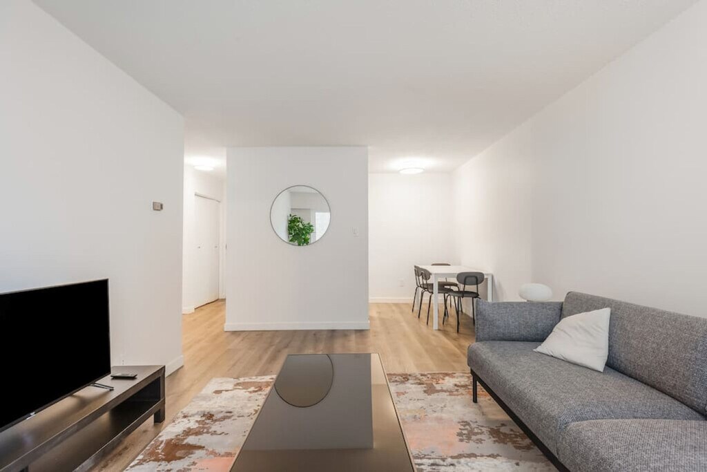 Feel at home in this newly furnished condo in peaceful Mount Pleasant, steps from vibrant Main St. This apartment offers a stylish, modern space. Enjoy a full kitchen, smart TV, private patio, and dining area. The bright, monochrome design features hardwood floors and natural light throughout. Dedicated parking is included. Walk to shops, cafes, and bars, or access excellent public transit for easy travel across Vancouver. No parties, events, or large gatherings are allowed, and smoking is prohibited. [SI]
