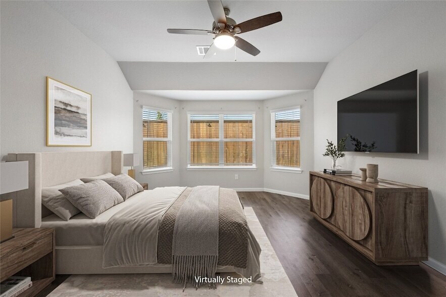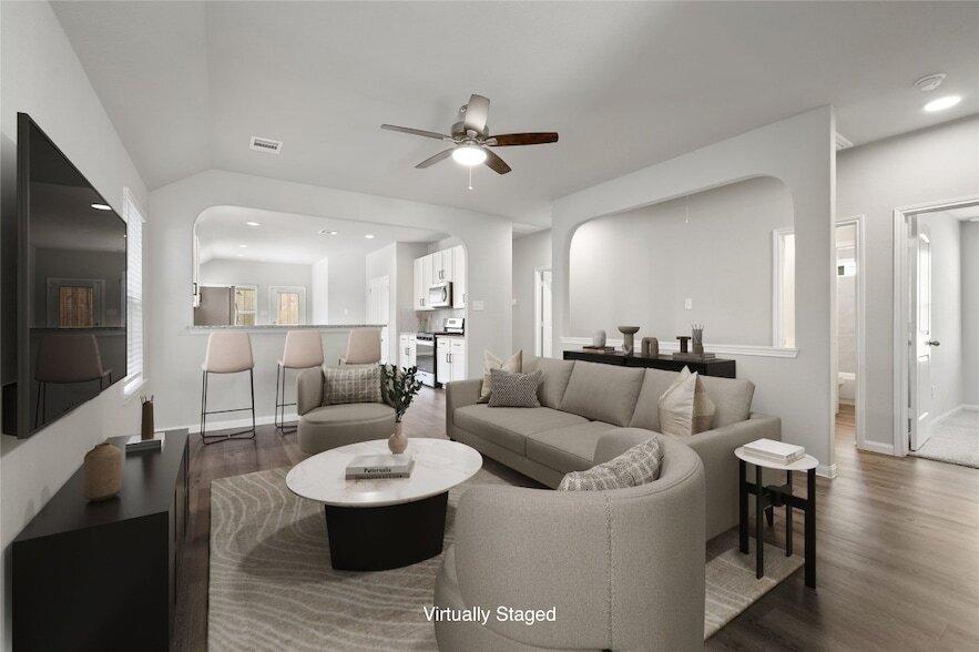 Welcome to River s Edge in Conroe! Built in 2022, this beautifully maintained 4-bedroom, 2-bath home offers modern comfort, thoughtful upgrades, and a peaceful setting with no back neighbors. Located on a quiet, fully built-out street with quick access to the community entrance, it combines privacy with convenience. Inside, the open-concept layout is perfect for everyday living and entertaining. The kitchen overlooks the living and dining areas and features stylish modern cabinet knobs for an upgraded touch. Vinyl plank flooring extends through the main living areas, primary bedroom, and one secondary bedroom, while the other two bedrooms offer carpet for added comfort. Enjoy the convenience of Eissler Elementary School, opened in August 2025, just a short walk away. Enjoy added privacy with no back neighbors, a tall fence, and the relaxing sound of the nearby water fountain from the covered patio. Community amenities include pool, playground, and trails. Move-in ready!
