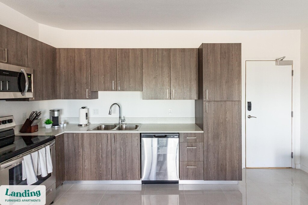 Landing offers flexible lease terms from weeks to months. Please always visit our website or contact us for the latest pricing & availability. Stay longer, save more: 6-Month Minimum base rent: starts at $3350/mo 12-Month Minimum base rent: starts at $2900/mo Landing offers flexible leases across a network of over 35,000 fully-furnished apartments throughout 375+ cities so you can rent on your terms, practically anywhere, and avoid the hassle of paying deposits or application fees. Visit to learn about all the benefits of a Landing membership, see our competitive up-to-date pricing, explore available apartments, take virtual tours, and make reservations online without jumping through traditional rental hoops. Landing's apartments at Modern Towers are designed for comfortable, easy living, with the ability to stay as long as you like. Experience living with Landing Every apartment is outfitted with all the modern essentials including: custom-designed furnishings, a fully-equipped kitchen with deluxe stainless steel appliances, a gourmet coffee maker, premium linens, Smart TVs, and incredibly fast, reliable internet for working from home. When you live with Landing, you'll enjoy a hassle-free experience with the added benefit of 24/7 access to our dedicated member experience team. Some of the nitty-gritty: a background check and proof of income are required; we're completely smoke-free; bundled utility packages and pricing vary based on length of stay; pet-friendly options available; listed price reflects a 12-month minimum stay.