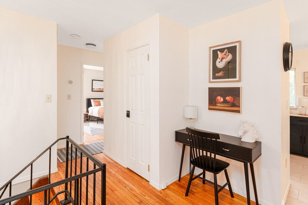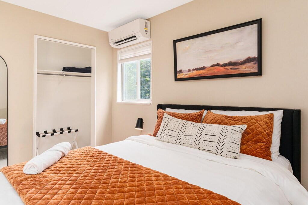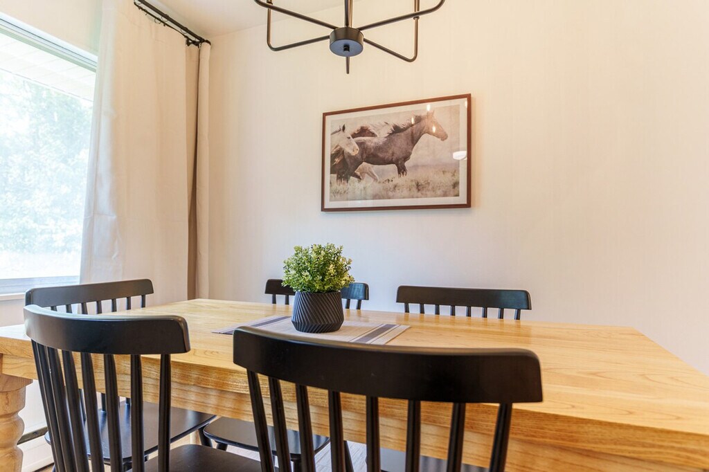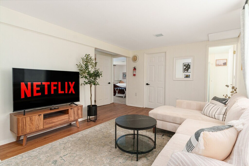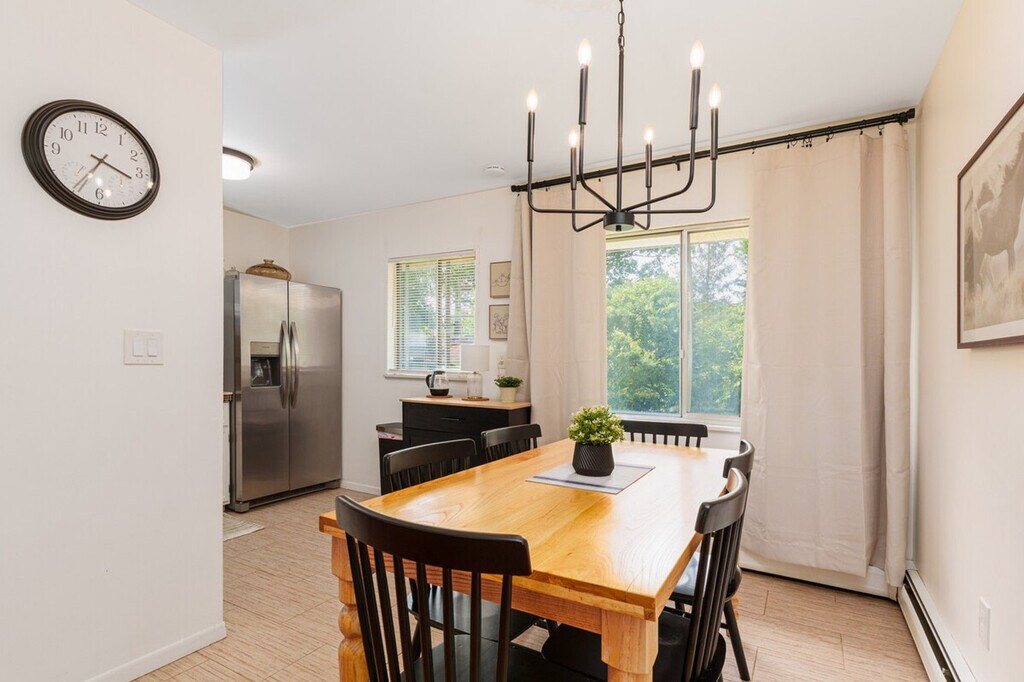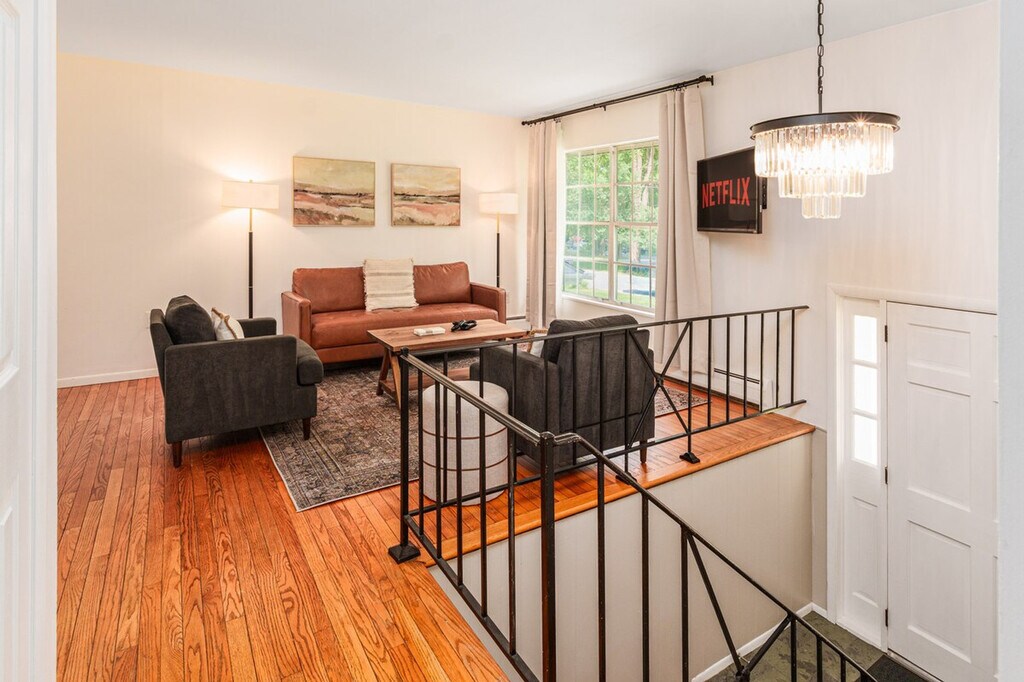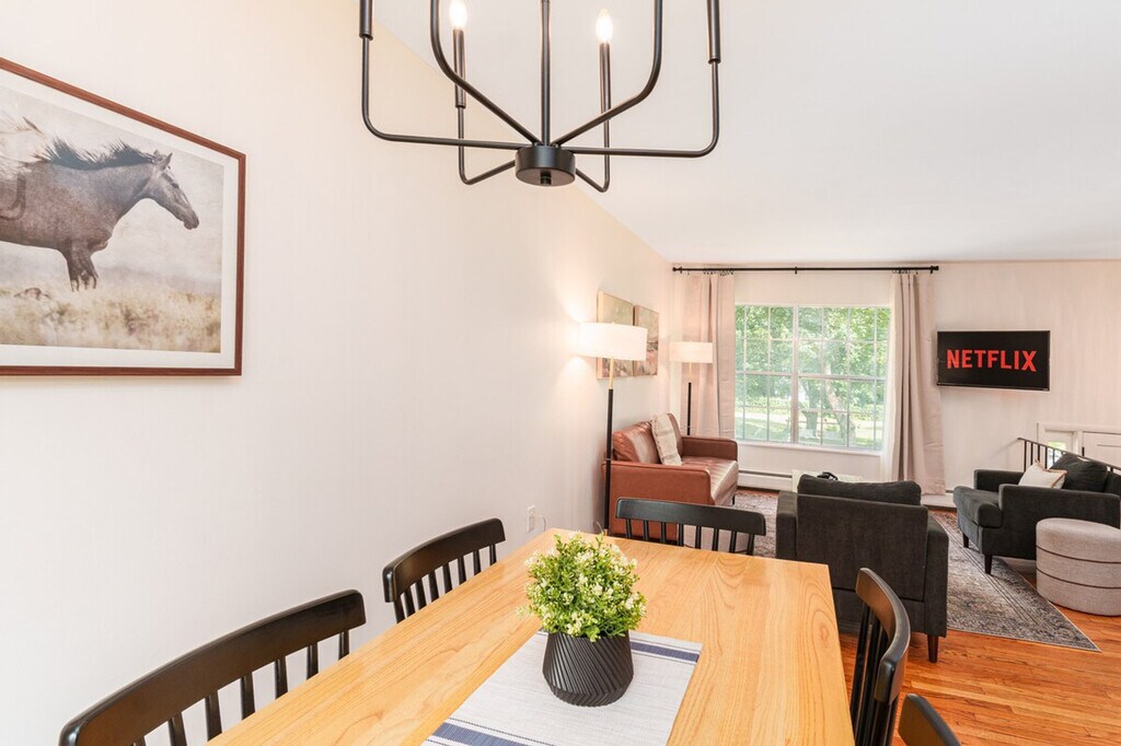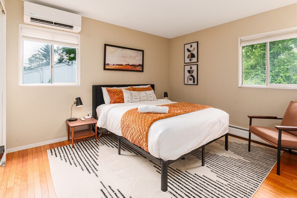 Welcome to this beautifully designed 4-bedroom retreat in Saratoga Springs, nestled in a quiet neighborhood near Spa State Park. This modern and spacious home is perfect for families, groups, or couples seeking comfort and convenience. Enjoy easy access to downtown Saratoga, SPAC, and all the area’s top attractions, making it your ideal home base. The home features four stylish bedrooms with plush queen beds and two beautifully updated full bathrooms. The bright, open-concept living space includes a cozy living room with a 65-inch Smart TV and large windows offering views of the surrounding forest. The modern, fully equipped kitchen comes with stainless steel appliances, a coffee bar, and all necessary cookware, complemented by a large dining table for shared meals. The property allows a maximum of 2 dogs, preferably aged 2 years and above, with a pet fee of $100 each. All dogs left unattended must be crated. Free parking is available on the premises, with additional street parking. Located just 0.7 miles from Saratoga Spa State Park and 1.9 miles from the Saratoga Performing Arts Center, this home offers proximity to downtown Saratoga, the Saratoga Race Course, and other local attractions. Enjoy the convenience of being close to grocery stores, mini golf, horse racing, swimming pools, shopping, casinos, restaurants, and museums. Guests are required to sign the property rental agreement, which includes the house rules. The home is fitted with a smart door lock for easy access. Minimum booking age is 25. Traveler's insurance is highly recommended for unexpected circumstances. Guests have access to a workspace, making it easy to stay productive during your stay. High-speed WiFi is available throughout the home, ensuring a seamless remote work experience. [SI]