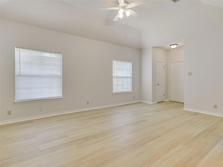 Remodeled duplex with open floor plan with 1 car detached garage. Large private back yard. High ceilings. Both roomy bedrooms have walk in closets. Remodeled kitchen opens to living and dining. New hard flooring throughout. Utility room. Private drive and secluded rear entrance. Perfect location, right off of Slaughter Ln. One of South Austin's most popular rental areas, close to South Park Meadows, schools & entertainment.