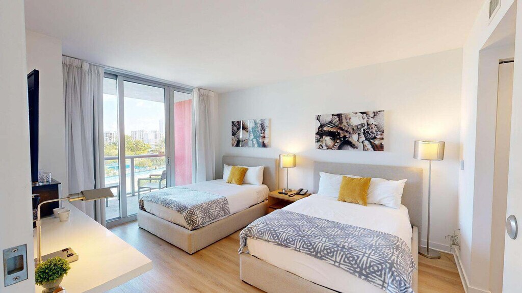 The advertised rate of $4,217/month is the lowest available price, based on a 30 day(s) stay with a move-in date of August 26, 2026. Rates vary depending on the duration of stay, season, and other parameters. For exact pricing and additional pricing components, please visit our website and enter your desired move-in and move-out dates. The rate is applicable when billed upfront; it can be higher if billed in multiple payments. Feel at home in this spectacular upper apartment at Beachwalk Resort, designed by Pininfarina (Ferrari), with private stunning views. This spacious upper 2-bedroom apartment features 1 full bath. The apartment features a balcony with stunning views of the Atlantic Ocean, Intracoastal Waterway, and downtown skyline. Enjoy resort-style amenities including home comforts, a pool, a gym, and wireless internet. This unit can comfortably accommodate up to 6 guests and has 2 private bathrooms and a TV. A Pack 'N Play Crib is available upon request. Package handling is available for $5 per package plus applicable taxes, and packages may be collected from the package room between 9 AM and 5 PM. Valet parking is available for 1 to 7 days at $28 per day per vehicle, plus taxes; 8 to 10 days at $25 per day per vehicle, plus taxes; 11 to 19 days at $250 per stay per vehicle, plus taxes; and 20 to 30 days at $295 per stay per vehicle, plus taxes. Located at the Beachwalk Resort, at the corner of Hallandale Beach Boulevard and the Intracoastal Waterway, this apartment is equidistant from Miami Beach to the south and Ft. Lauderdale to the north. It is just one easy block to the beach and minutes from nightlife, dining, shopping, and recreation. Just beyond the resort, you'll find the Hollywood Beach boardwalk and miles of Blue Wave-designated beaches. The resort is surrounded by restaurants and the world-famous Gulfstream Park. To the west, you can visit the famous Hard Rock Guitar Hotel & Casino. To the south, you can continue to the Aventura Mall, or head to South Beach. To the north, you can enjoy more shopping and restaurants in Fort Lauderdale. The apartment is minutes from Fort Lauderdale Airport. For groceries, you will find a 24-hour Walmart right next door and a Publix Supermarket a two-minute drive away. A $500 fine will be applied for any smoking violation. Please keep all doors closed and the air conditioning on at all times to help prevent condensation and property damage. Quiet hours are from 10:00 PM to 07:00 AM. Please maintain low noise levels to ensure a relaxing stay for all guests. Excessive noise or property damage may result in penalties. [SI]