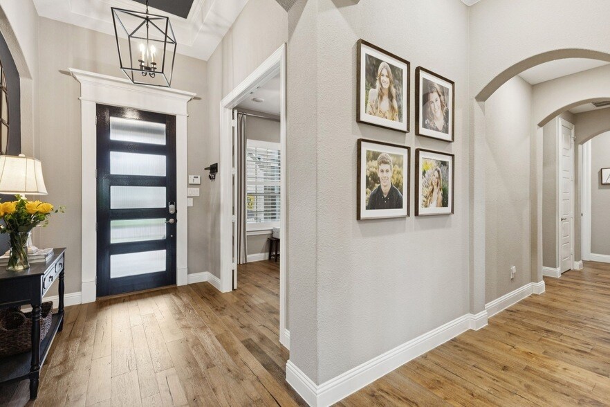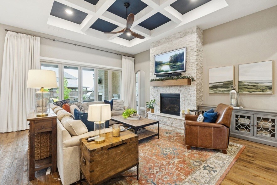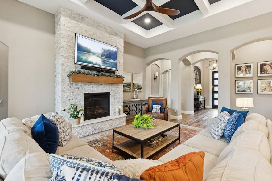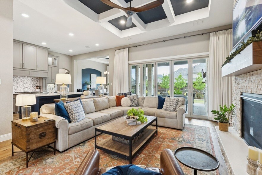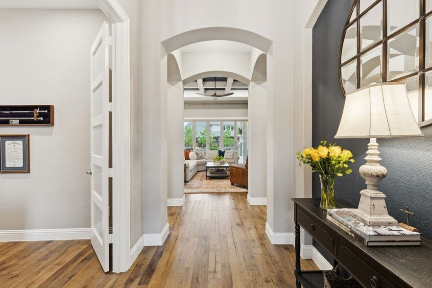 Step inside this exceptional home where thoughtful design and comfortable living come together in a spacious single-story property loaded with upgrades. This layout features a private suite with its own living room, coffee bar, large bedroom, and walk-in shower ideal for guests or multi-generational living.The kitchen is the heart of the home with quartz counters, double convection ovens, premium stainless appliances, and generous storage that makes both everyday meals and hosting a breeze. California doors open wide from the central living area to the extended covered patio, blending indoor and outdoor living. Natural light fills the dining area, creating the perfect place for gathering. The dedicated office features custom built-ins that set the stage for productive days.The primary suite feels like a retreat with a private seating area and spa-like features such as separate vanities, soaking tub and Texas sized walk-in shower. The generous primary closet connects directly to the laundry room for added convenience.Two additional secondary bedrooms include bay windows and walk-in closets. The game room offers a flexible space for entertaining. The garages stand out with epoxy flooring and built-in cabinetry, offering storage and room for a workshop or golf cart. Living in Mustang Lakes also comes with resort-style community amenities, including fishing ponds, pools, fitness center, walking trails, tennis and basketball courts, playgrounds, and a full-time lifestyle coordinator.