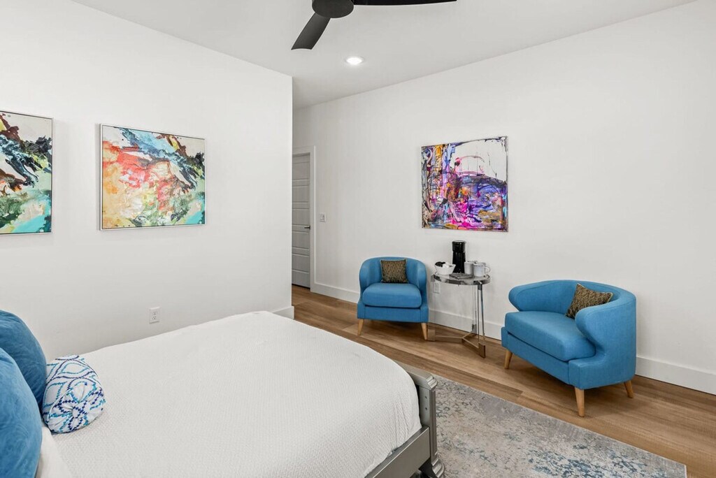 Feel at home in this curated one-bedroom suite located in The Gallery condos, blending modern comfort with Southern charm. Just minutes from Crystal Bridges Museum, boutiques, and bike trails, this apartment offers a stylish décor, a spa-inspired bathroom, and thoughtful touches throughout. Immerse yourself in Bentonville’s art scene with this apartment's spacious lounge featuring two pull-out sofas and a 75? Smart TV for movie nights. The kitchenette includes a mini-fridge, microwave, Keurig, and locally roasted coffee. Enjoy a restful sleep in the queen bed with premium bedding and ample closet space. The spa bathroom boasts a double vanity, walk-in shower, and plush towels. A dedicated workspace and high-speed internet make it remote work-friendly. Well-behaved dogs are welcome with a fee of $75 per dog, with a maximum of two dogs allowed. Unfortunately, no cats or other pets are permitted. Located directly across from Osage Park and Thaden Field, enjoy scenic walking and biking trails with easy access to Bentonville’s extensive trail network. Minutes from Crystal Bridges Museum of American Art, The Momentary, Walmart Museum, and the Museum of Native American History, this apartment is perfect for art enthusiasts. Experience Bentonville’s award-winning culinary scene with local dining options like Onyx Coffee Lab, The Hive, and Tavola Trattoria. Just a short drive to Bentonville City Square for boutique shopping, seasonal festivals, and small-town charm. Free parking is available, and the apartment is just 20 minutes from Northwest Arkansas National Airport (XNA). This apartment offers hassle-free check-in with keyless entry codes sent before arrival. While smoking is prohibited anywhere on the property, odor remediation can easily exceed $1,000 if violated. No parties or events are allowed, and quiet hours are from 8 p.m. to 8 a.m. Children and infants are welcome, but please supervise them at all times. Starter supplies like toilet paper, paper towels, and toiletries are provided, but you may need extras for extended stays. Includes a dedicated workspace and high-speed internet, making it remote work-friendly. A laptop computer is not included.