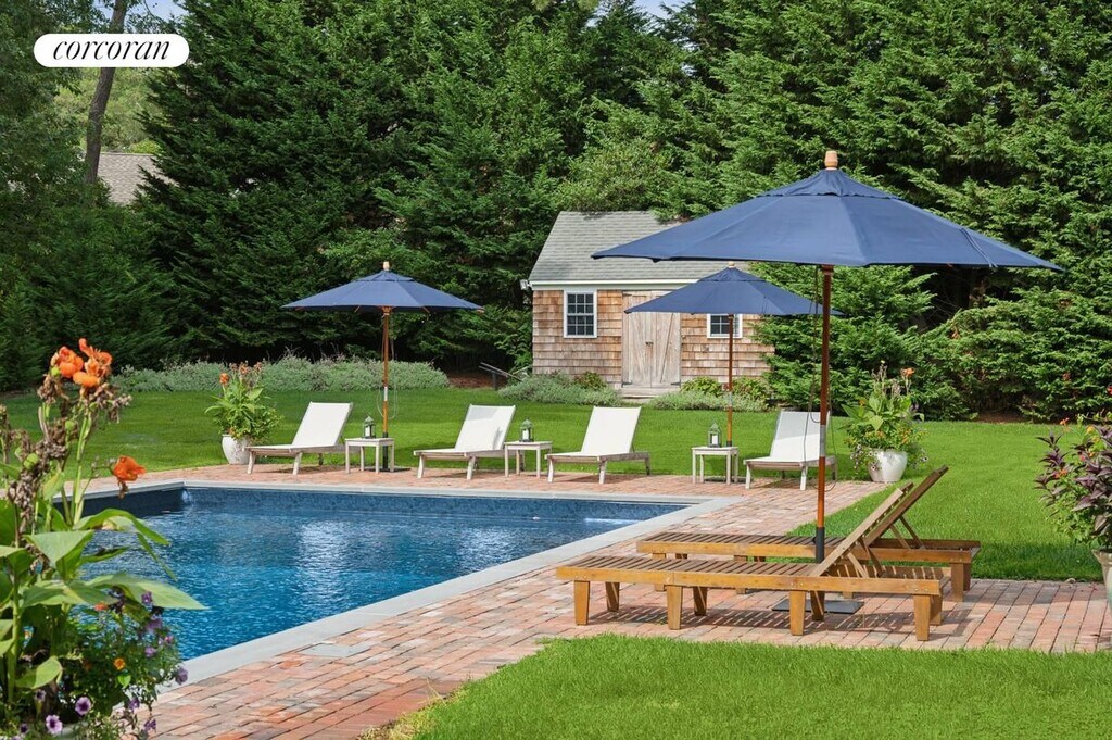 Indulge in the ultimate summer getaway at this newly renovated 4,000 sq. ft. masterpiece. Perfectly designed and professionally decorated, this stunning home offers 5 spacious bedrooms, 5.5 elegant baths, and an open-concept living space with hardwood floors throughout. The heart of the home features a gourmet kitchen, a massive media room with a cozy fireplace and a big screen TV, and a formal dining area perfect for entertaining. The full finished basement adds even more room for relaxation and fun. Step outside to your private oasis-an expansive mahogany deck overlooking a heated Gunite pool, an outdoor shower, and lush lawn space where the kids can play. With new deck furniture, it's the perfect spot to unwind. Just minutes from Southampton Village and the pristine beaches, this is a place where luxury and convenience come together for the perfect summer experience. [[Rental Registration # RP201531]]