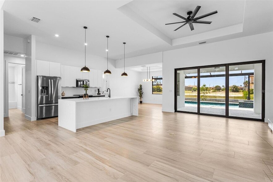 DIRECT GULF ACCESS WATERFRONT CONTEMPORARY HOME in TAURUS CANAL w/ 4-bed, 3-bath, Jacuzzi Spa & Pool & 3-Car Garage! A RETREAT for BOATING ENTHUSIASTS & ANYONE WHO CHERISHES SWFL PARADISE LIFESTYLE! PRIME LOCATION near future SEVEN ISLANDS WATERFRONT COMMUNITY, featuring planned marinas, parks, dining & resort-style amenities! This HOME offers DIRECT ACCESS to GULF, 8-10 miles away. Located on TAURUS CANAL, it provides Gulf access through LAMARK CANAL into LAGUNA LAKE and then into NORTH SPREAD WATERWAY NO BRIDGES! From here, you ll have access to Matlacha Pass, Charlotte Harbor north & San Carlos Bay south. Whether you're cruising, fishing, or simply enjoying views, this home s WATERFRONT SETTINGIS GREAT for those WHO LOVE WATER! Property features 125 ft SEAWALL & PLENTY OF SPACE FOR YOU TO ENJOY FISHING, BOATING, KAYAKING! This BEAUTIFUL HOME not only caters to WATER ACTIVITIES but also SPACIOUS OUTDOOR ENTERTAINMENT AREA, SCREENED, for RELAXING & HOSTING GATHERINGS. Bright w/ open floor plan, allowing NATURAL LIGHT TO FILL SPACE & highlight its MODERN DESIGN! WESTERN REAR EXPOSURE offers BREATHTAKING SUNSETS & ample natural light, while you enjoy VIEWS OF POOL, JACUZZI SPA, & SALTWATER WATERFRONT, making it ideal spot for relaxing, swimming, fishing, or enjoying outdoor meals on the lanai! EXPANSIVE LIVING ROOM features 14-foot cove ceiling & offers views of LANAI & SALTWATER CANAL! Interior details are designed for COMFORT & STYLE, including TILE FLOORING THROUGHOUT & impact-resistant doors & windows for added peace of mind. MODERN KITCHEN w/ SS appliances, including refrigerator/freezer, microwave, range & dishwasher. It features BLACK AND WHITE ITALIAN CABINETS & spacious QUARTZ WATERFALL ISLAND w/ BREAKSFAST BAR. Primary suite offers plenty SPACE, including PRIVATE SLIDING DOORS TO LANAI & LARGE walk-in closets w/ wood shelving & hangers. Primary SPA BATHROOM features separate tub & shower, dual sinks & quartz countertops - the spot to unwind & relax after a day boating! SPLIT FLOOR PLAN provides privacy for both residents & guests. 3 GUEST BEDROOMS are perfect for hosting family or friends. One is located at rear of the home, next to POOL BATHROOM, while the other two are at front, sharing a bathroom in hallway between them. Laundry room located as you walk into from garage & includes washer & dryer hook up & utility sink. Spacious 3-CAR GARAGE provides room for vehicles, storage & hobbies, offering both CONVENIENCE & VERSATILITY. Come explore this beautifully designed home w/ DIRECT GULF ACCESS & AMPLE OUTDOOR ENTERTAINMENT SPACE offering lifestyle, convenience & location!