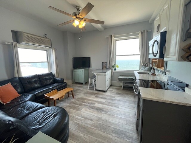 Property Id: 2266950 Shorter term leases considered. Everything you need and everything you want is waiting for you in this upgraded oceanfront, corner condo. You can't beat the location of this high rise directly on the boardwalk, on the north side of the Tropicana. Your toes are in the sand in seconds! Exquisite building amenities include an indoor pool, inside and outside hot tubs, sauna, gym, lounge areas, business center, ballroom, locker rooms, 24 hour security with key fob entrance. The elegant Ritz Condo Building has many modern conveniences while maintaining vintage throwbacks to its 1920s original construction such as a grand staircase,ballroom, and original marble tile on the first and second floor. The association keeps the common areas impeccably clean and requires background checks. There are no nightly or less than a month rentals allowed, which makes for a calmer, safer environment for a high rise with so much to do as soon as you step outside the building. Your personal space is bright and beautiful with uninterrupted views of the ocean and boardwalk from every oversized window. Enjoy a fabulous cross breeze from this upgraded, corner condo. There's a queen bed and loveseat in the main bedroom. In the second bedroom is a low loft Pottery Barn twin bed with a bookcase. The 3 drawer dresser and desk on wheels can be stored under the loft or positioned around the room. An open living room has a sectional sofa, tv and kitchen area with quartz counter tops, stove, microwave, and dishwasher. There's a full sized refrigerator around the corner in the hallway along with an extra, walk-in storage closet. The bathroom can be accessed from the hallway or the main bedroom. Rental Fees and Requirements: $250 monthly utility fee covers electric, heat, water, wifi, one parking spot near the building $55 Background and Credit Check fee $300 Leasing Fee $2925 Security Deposit