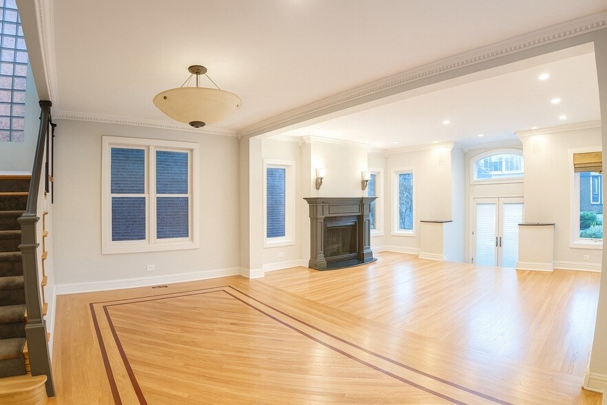 Lease to end at the end of June either 2026 or 2027. Spacious and elegantly finished open-concept living area featuring beautiful hardwood floors, a striking black mantle fireplace, and custom trim details throughout. Modern recessed lighting and high ceilings create a bright and inviting atmosphere perfect for entertaining. Designer kitchen combines elegance and functionality with custom ceiling-height cabinetry, sleek black granite countertops, and warm hardwood floors. A spacious center island with a built-in gas cooktop offers the perfect space for meal prep or casual dining, while under-cabinet and recessed lighting illuminate every corner. High-end stainless steel appliances, including double wall ovens, a built-in microwave, and a paneled refrigerator, add both style and convenience. The thoughtful layout provides exceptional storage and workspace, making this kitchen ideal for both everyday living. Sun-filled master suite with vaulted ceilings, recessed lighting, and a contemporary overhead fixture that creates an elegant ambiance. French doors open to a private balcony, while oversized windows and a skylight bathe the space in natural light. Gleaming hardwood floors add warmth and sophistication, and the generous layout easily accommodates a king-size bed with room for a sitting area or additional furnishings. The primary bathroom features a dual-sink vanity topped with granite counters and sleek chrome fixtures. A spacious jetted soaking tub is set beneath privacy windows, while the frameless glass shower offers both a rainfall and handheld showerhead, plus a built-in bench for comfort. Warm stone tile flows throughout the tub surround, shower, and flooring, complemented by light gray walls and vaulted ceilings. Natural light pours in through a skylight, creating a bright, inviting retreat with a true spa-like atmosphere. Beautifully finished lower level offers both comfort and versatility. A custom wet bar with granite countertops, glass-front display cabinets, and abundant storage creates the perfect setting for entertaining family and friends. Across the room, an entire wall of built-in shelving and cabinetry provides an elegant solution for books, media, or decorative displays. Enhanced by recessed lighting, wall sconces, and neutral finishes, giving the space a warm and inviting feel. A classic staircase with decorative railings adds architectural detail while seamlessly connecting to the rest of the home. With plenty of room for a recreation area, media lounge, or home office, this flexible space is designed to fit a variety of lifestyles.