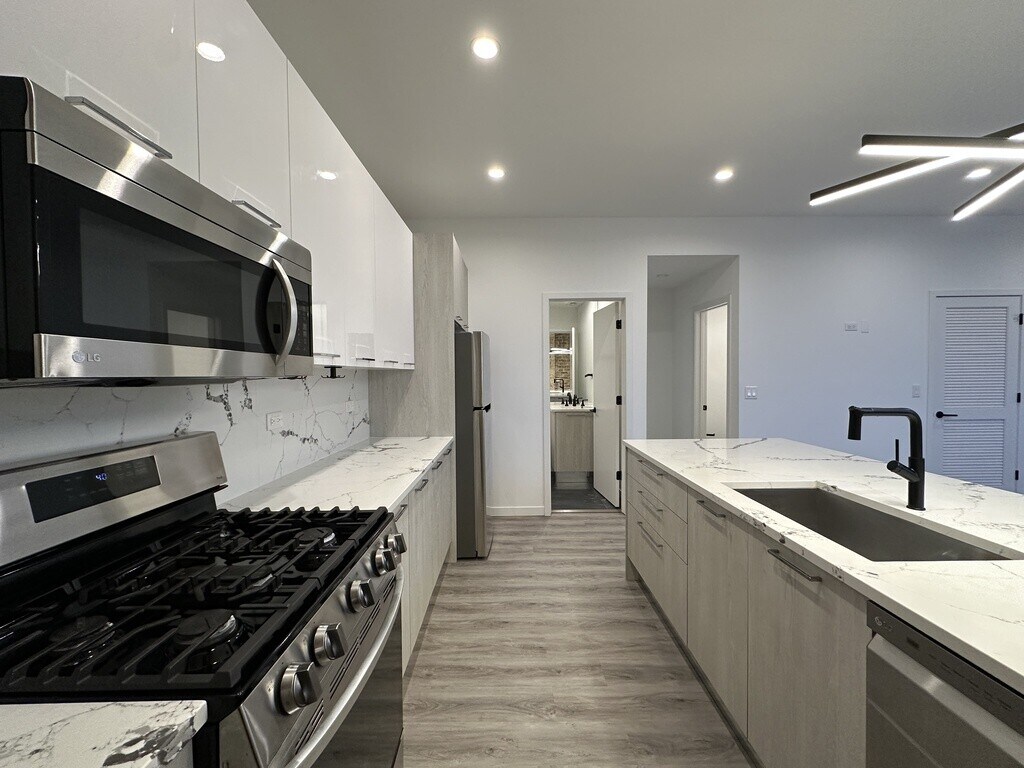 We now offer virtual video tours of all of our apartments! Schedule a virtual tour and rent this apartment from the comfort and safety of your home! Apply online! Unforgettable two bedroom, one and a half bathroom in Humboldt Park features rehabbed kitchen with modern cabinets, LG stainless steel smart appliances, dishwasher, microwave, quartz countertops, breakfast bar, separate dining room, spacious living area, large bedrooms, great closet space, tall ceilings, exposed brick, central heat and air, tankless hot water heater, rehabbed bathrooms, in unit laundry, shared back deck, and pets are welcome. Short walk to Humbodlt Park! Won't Last Long!