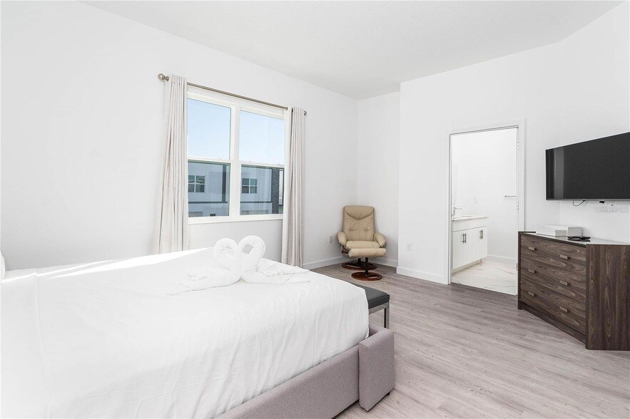 Experience the modern style of this 5-bed, 4-bath townhouse, boasting a private pool, now ready for leasing in The Azur Resort. The coming soon clubhouse will include a contemporary clubhouse, a stylish community pool, a play ground, and a Health and Wealth Fitness Facility. Please be advised that pets are not allowed. Ideally situated just three exits away from Disney, in proximity to Aldi, Publix, Wawa, shopping hubs, the newly established Orlando Health Center, and with swift access to I-4, Champions Gate and its golf courses are conveniently less than a mile away. Vacant. The property is fully furnished.