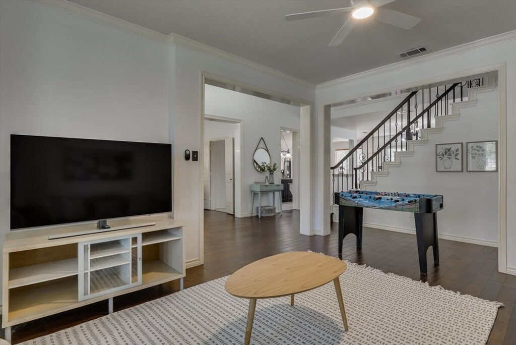 Welcome to this stunning 5-bedroom, 3-bathroom home located in the vibrant city of Plano. Perfectly situated near exciting attractions, this home offers a warm and relaxing environment after a day of adventure. Featuring a large fully equipped kitchen, a game room, an outdoor grill, and a bright blue pool, this home is your ideal retreat. This home caters to both short-term and medium-term stays, making it an excellent choice for corporate housing needs. With traditional architecture and a beautifully landscaped front yard, the grand exterior welcomes you. Inside, the open floor plan boasts hardwood floors, iron balusters, and contemporary décor. The living room offers high-end furnishings and a cozy atmosphere with a fireplace. A second living area serves as a game room with comfy furniture, a piano, and a foosball table. The spacious kitchen features granite counters, a stone backsplash, and stainless-steel appliances, along with a dining room and breakfast area overlooking the backyard. The five bedrooms are large and well-furnished, and the three full bathrooms include modern upgrades. The master bath offers a walk-in shower and soaking tub. The backyard oasis includes a covered patio dining set, a shimmering pool, and a swing chair. This home welcomes house-trained pets with a non-refundable pet fee of $150 per pet, with a maximum of two pets per stay. Additional guests beyond six incur a $29 per night fee. Parking is available in the garage to protect your vehicle from the elements. Located in an excellent area of Plano, this home is just 15 minutes from the University of Texas at Dallas, 30 minutes from DFW airport, and 40 minutes from downtown Dallas. Nearby attractions include the Go Ape Zipline and Adventure Park, Andretti Indoor Karting, and the Crayola Experience. Nature enthusiasts will enjoy the nearby Bob Woodruff Park and Oak Point Park and Nature Preserve, offering extensive trails and outdoor activities. Shopping and dining options abound at The Shops at Willow Bend and Legacy West. Smoking is not allowed and violations are subject to a $450 fine plus cleaning costs. Check-in is at 4pm and check-out is at 10am. No parties or large gatherings are allowed, and noise levels are monitored to ensure compliance with local ordinances. The spa heating element and jets are inoperable, and guests are advised to bring their own pool towels. The fireplace is gas-operated and should not be left unattended. Room #5 is opened for groups of 12 or more guests. Pets should be discussed in advance and kept off beds and furniture. Includes high-speed Wi-Fi and a comfortable living space suitable for remote work. Registration Number: STR-2800-016 [SI]