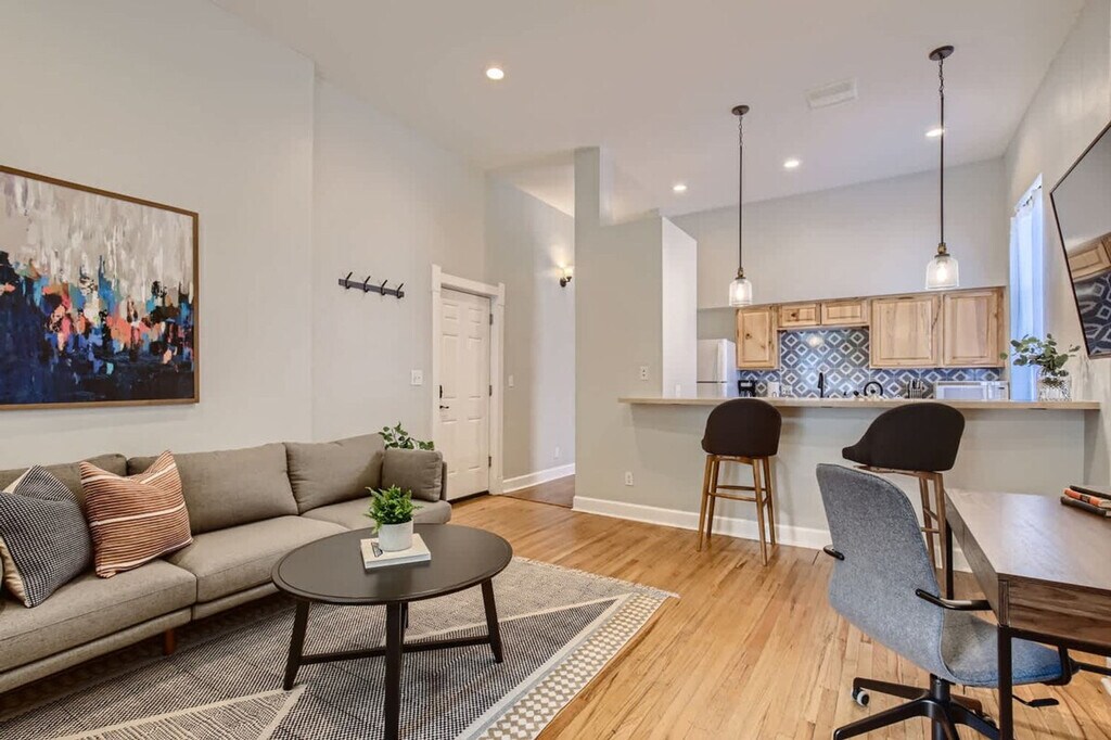 Feel at home in this charming 1-bedroom apartment located on the first floor at 2805 E 16th Ave. With 665 sqft of space, this residence boasts an open concept kitchen overlooking the den, and large east-facing windows that flood the apartment with natural light. Enjoy a coffee or a glass of wine from the rocking chairs on the front porch just outside your window. Newly renovated and furnished in Fall 2022, this apartment features a comfy queen bed with linens and a fully stocked kitchen. With plenty of closet space and additional storage available upon request, you'll find everything you need for a comfortable stay. Enjoy free street parking with a 2-hour limit from 8am-6pm Monday through Friday, and unlimited parking on nights, weekends, and holidays. Apply for a 90-day parking pass to park in the 2-hour zone without restrictions. This dog-friendly apartment requires a pet rent of $90 per dog per month, with a strict no cats policy. Situated in a prime location, this apartment is just 1 block from City Park and 5 minutes from Cheesman Park and the Botanic Gardens. You're 8 blocks from Sprouts Farmers Market and 8 minutes from Cherry Creek Shopping District. Downtown Denver, RiNo, and LoHi are only 10 minutes away, while Red Rocks and ski resorts are within a 30-minute to 1.5-hour drive. Nearby hospitals include St Joseph, Presbyterian St Luke’s, and Rose, all within 5 minutes, and UC Health University of CO and Children’s Hospital CO within 15 minutes. Check-out time is 10 AM, with a $50 fee for every additional 30 minutes past this time. All properties are non-smoking and non-vaping, with violation resulting in damage fees. Noise disturbances are monitored, with eviction possible for repeated violations without refund. Guests are responsible for removing personal property at check-out, with a minimum $50 fee for returning items left behind. Early check-in may be available upon request. Shared, free laundry is available in the basement, and guests control window AC units and fans, while central heat is controlled by the host. This apartment offers two separate remote work-friendly spaces in the den and bedroom, equipped with fast internet at 300mbps download and 10mbps upload speeds. A shared router may or may not be in-unit. [SI]