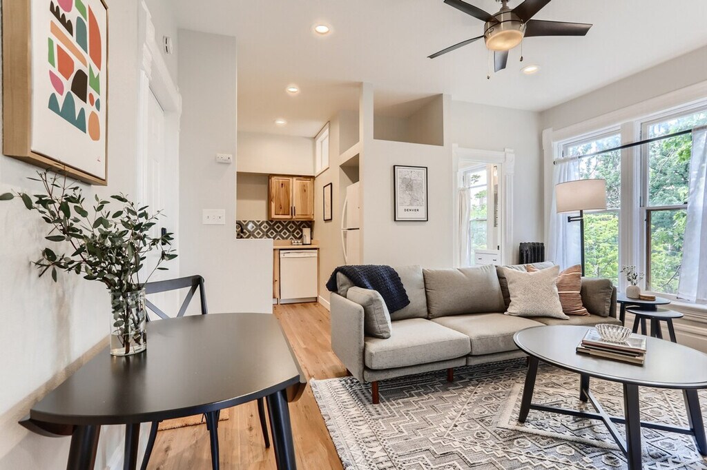 The advertised rate of $2,855/month is the lowest available price, based on a 1 month(s) stay with a move-in date of April 30, 2026. Rates vary depending on the duration of stay, season, and other parameters. For exact pricing and additional pricing components, please visit our website and enter your desired move-in and move-out dates. The rate is applicable when billed upfront; it can be higher if billed in multiple payments. Feel at home in this 465 sqft 1-bedroom apartment, Unit #10, located on the 3rd floor of the building. Large west-facing windows in each room create a treehouse-like ambiance. This newly renovated apartment, furnished by a designer in Fall 2022, features a comfy queen bed with linens and a stocked kitchen. Enjoy the convenience of a smart TV for streaming your favorite services, and free communal laundry in the basement. Pet rent is $90/dog/month. Please add your dog to the reservation, so the pet rent can be collected. Located one block from City Park and a short distance from other attractions, this apartment is ideally situated. It's 5 minutes to Cheesman Park & Botanic Gardens, 8 blocks to Sprouts Farmers Market, 8 minutes to Cherry Creek Shopping District, 10 minutes to downtown Denver, RiNo, and LoHi, 30 minutes to Red Rocks, and 1 hour and 30 minutes to ski resorts. Nearby hospitals include St Joseph, Presbyterian St Luke’s, and Rose (5 minutes away), and UC Health University of CO and Children’s Hospital CO (15 minutes away). Check out time is 10 AM. Failure to check out on time will incur a $50 fee for every additional 30 minutes. The team is available during business hours (9am to 5pm, Monday through Friday) and after hours for emergencies. This is a dog-friendly property, but cats are not allowed. Many guests work from home, so please be mindful of noise. A warning will be given for any reported noise disturbances, and additional disturbances will result in eviction from the property. Includes great work-from-home workspaces in the den. [SI]