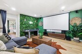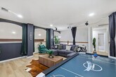 Feel at home in this eco-chic, two-story brick home in McKinney. This spacious home features 4 bedrooms and 2.5 bathrooms. This home offers a fully equipped kitchen with stainless steel appliances and a center island, a formal dining area with seating for 8, a cozy breakfast nook with seating for 4, and an elegant living room with a comfortable sectional and flat-screen TV. For entertainment, there is a cinema room with an air hockey table. Additional amenities include complimentary parking and a laundry room with a washer and dryer. The backyard is fully fenced and landscaped with a swimming pool, BBQ grill, furnished patio, hot tub, and fire pit. An EV charger is available in the garage. There is an additional nightly rate for parties of more than six guests, with a fee of $29 per additional guest. House-trained pets are welcome with a non-refundable pet fee of $150 per pet, with a maximum of 2 pets per stay. Located less than 30 minutes from downtown Dallas, McKinney offers a historic downtown area with shops, restaurants, and bars. Nearby attractions include the Heard Natural Science Museum and Wildlife Sanctuary, Chestnut Square Historic Village, and Mitas Hill Vineyard. Dallas attractions such as NorthPark Center, the University of Texas at Dallas, and the Heritage Farmstead Museum are also within driving distance. No street parking is allowed due to city parking regulations. The maximum number of cars allowed are 2 in the garage and 2 in the driveway. Smoking of any type is not allowed, and violations are subject to a $450 fine plus the cost to clean, deodorize, and repair damages. Only registered guests are allowed on the property. The fireplace is operated on gas and should only be used by those familiar with its operation, and should not be left unattended. Plenty of body towels are provided, but guests are welcome to bring their own pool towels. To comply with local noise ordinances and prevent unauthorized parties, a noise alert device has been installed that monitors decibel levels, but does not record or store sound data. [SI]