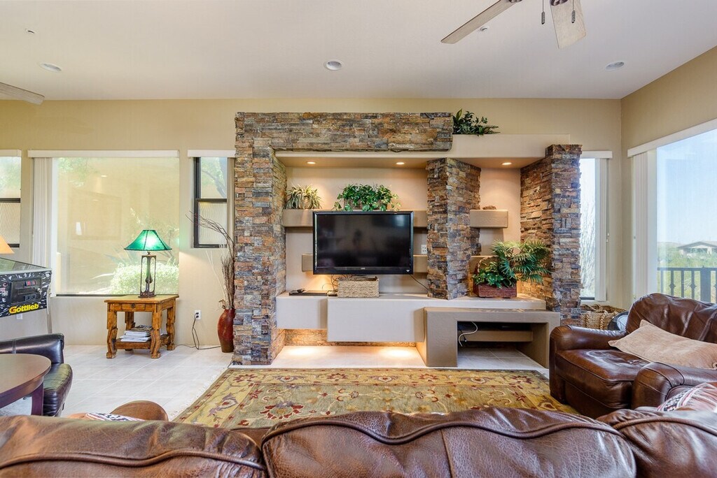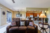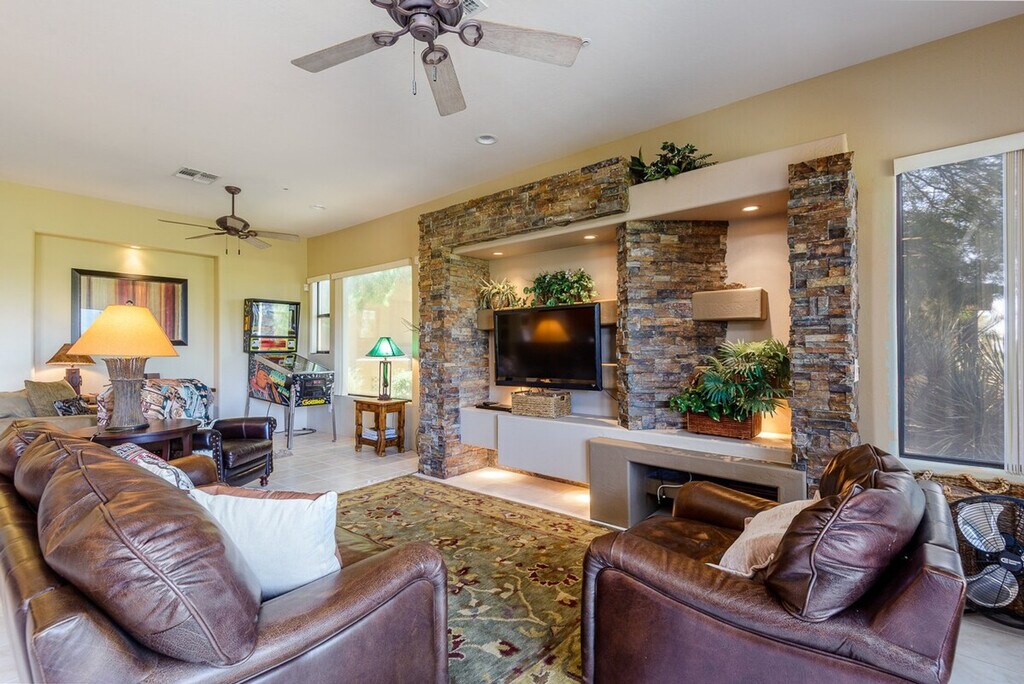Troon Villa Agave is a stunning 2,450-square-foot, very large 2-bedroom, 2-bathroom apartment located right on the Troon Golf Course, offering unbelievable views directly from the fairway. This luxurious home features two master bedrooms, each with king-size beds, flat-screen televisions, attached baths, and private balconies with breathtaking views. A separate office work area divides the two master suites on the second level. The first level includes a 2-car attached private garage, laundry room, and powder room, leading into a huge great room with a chef's kitchen, granite and stainless appliances, a long breakfast bar, and a large dining table. The space opens with two large sliding doors to a spacious patio overlooking the Troon North Golf Course, mountains, and city lights. The apartment boasts two master bedrooms with king-size beds, flat-screen televisions, attached baths, and private balconies. The chef's kitchen is equipped with granite and stainless appliances, a long breakfast bar, and a large dining table. Comfortable seating surrounds the custom entertainment center for relaxation, and the space opens to a large patio with stunning views. One dog is allowed with prior verbal approval, and a non-refundable pet fee will be added to your booking. Parking is available in the 2-car garage provided, but parking in the driveway is not allowed. A short walk will take you to the heated pool, spa, fitness room, and the Troon North Golf Club and restaurant, making it an ideal location for both relaxation and recreation. Guests are liable for any damages caused to the property. All linens, bath and pool towels are provided, and free Wi-Fi is available. The property is managed to hotel standards, and personal check-in is conducted to ensure comfort. Someone will be on call during your stay to answer questions or solve any unforeseen issues. A separate office work area is available, providing a dedicated space for work or study. [SI]